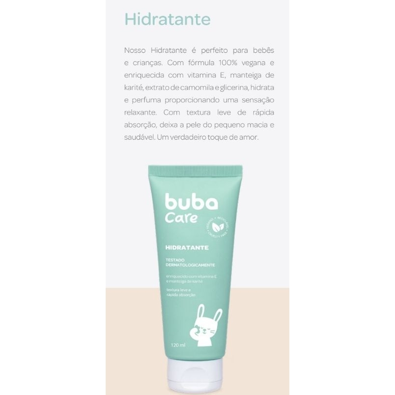 Hidratante Infantil Hipoalergênico 120ml BubaCare Nosso Hidratante é perfeito para bebês e crianças. Com fórmula 100% vegana e enriquecida com vitamina E, manteiga de karité, extrato de camomila e glicerina, hidrata e perfuma proporcionando uma sensação relaxante. Com textura leve de rápida absorção, deixa a pele do pequeno macia e saudável. Um verdadeiro toque de amor. Modo de uso Coloque um pouco do Hidratante Buba Care nas mãos, espalhe pelo corpo do bebê e massageie suavemente até que a pele absorva o produto. Pode ser usado diariamente. Precauções Deve ser aplicado por um adulto ou com sua supervisão. Evitar contato com os olhos. Em caso de irritação, suspender o uso e procurar um médico. Uso externo. Não ingerir. Manter fora do alcance de crianças. Caso o produto entre em contato com os olhos, lavar com água corrente em abundância e procurar um médico. Manter em local seco e longe do alcance do sol.