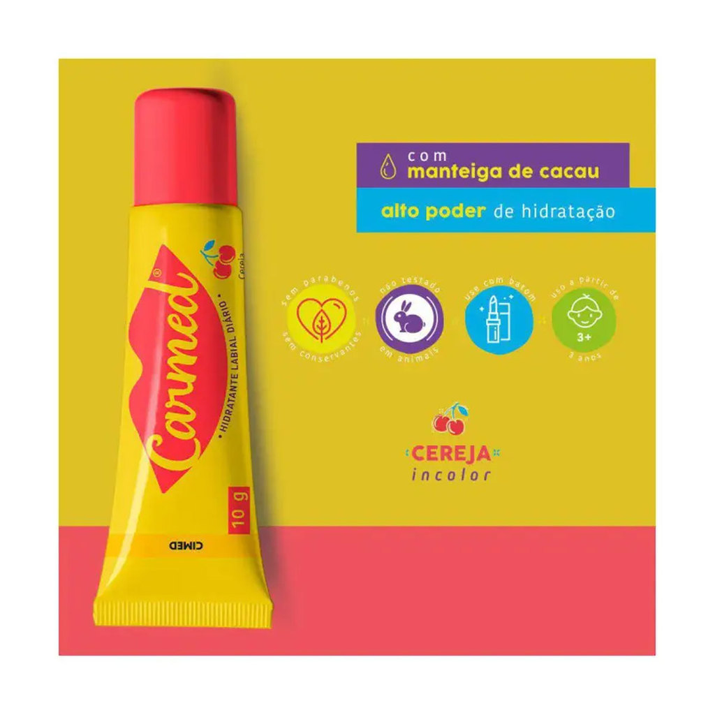 O Carmed Cereja é o hidratante labial queridinho das besties! Super refrescante, ele é incolor e perfeito pra qualquer momento. Ele hidrata, protege contra o ressecamento e ainda cuida dos lábios, proporcionando maciez. É o clássico que nunca sai de moda. Sem parabenos e conservantes. Não testado em animais. Pode ser usado a partir de 3 anos. Hidratante labial em bisnaga. Detalhes: - Não é hidratante em bastão. - Possui alto poder de hidratação e restauração. - Mantém a umidade natural dos lábios, - Auxilia no tratamento e na prevenção das rachaduras labiais. - É incolor. - É compatível com o uso de batons. - Oferece gostinho suave de cereja. - Composição: Lanolina + Manteiga de cacau + Mentol + Vaselina + Cera de abelha.