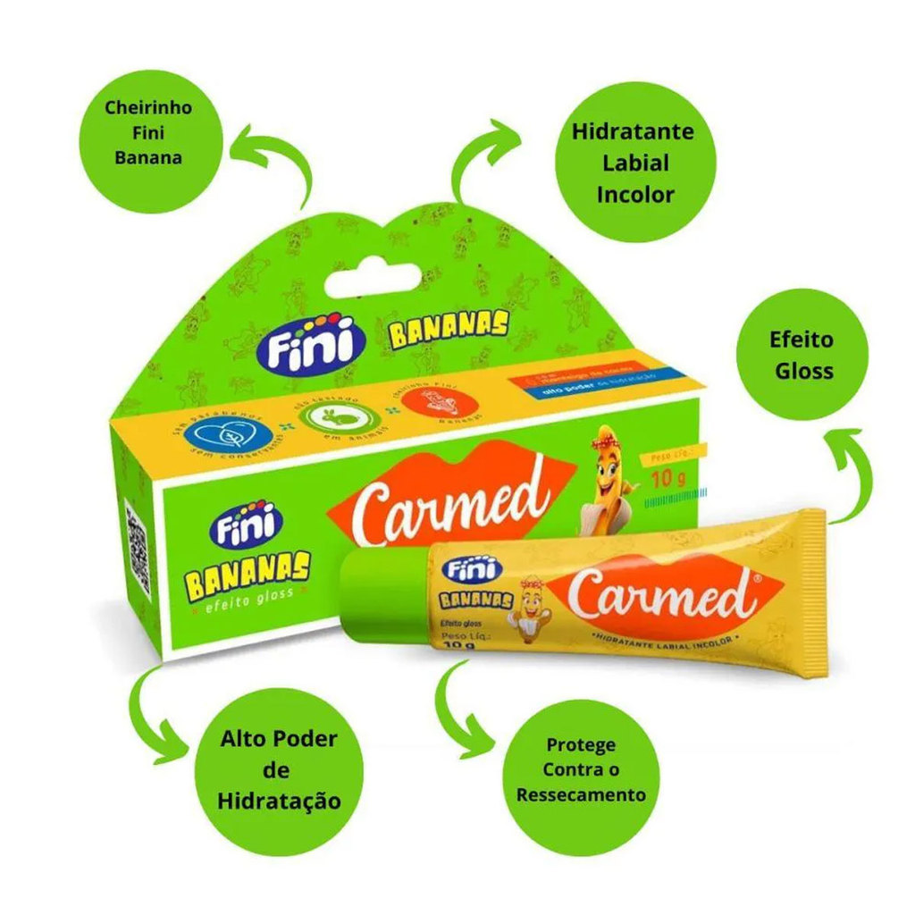 Proteja seus lábios do ressecamento e dê um toque radiante ao seu sorriso com o Hidratante Labial Carmed Fini Bananas Efeito Gloss. Com uma deliciosa fragrância de bananas, esse hidratante labial vai deixar sua boca macia, hidratada e com um brilho incrível. Detalhes: - Hidrata intensamente e proporciona efeito gloss. - Fragrância deliciosa de bananas. - Protege os lábios em ambientes secos. - Dermatologicamente testado e hipoalergênico. - Embalagem compacta para uso em qualquer lugar.