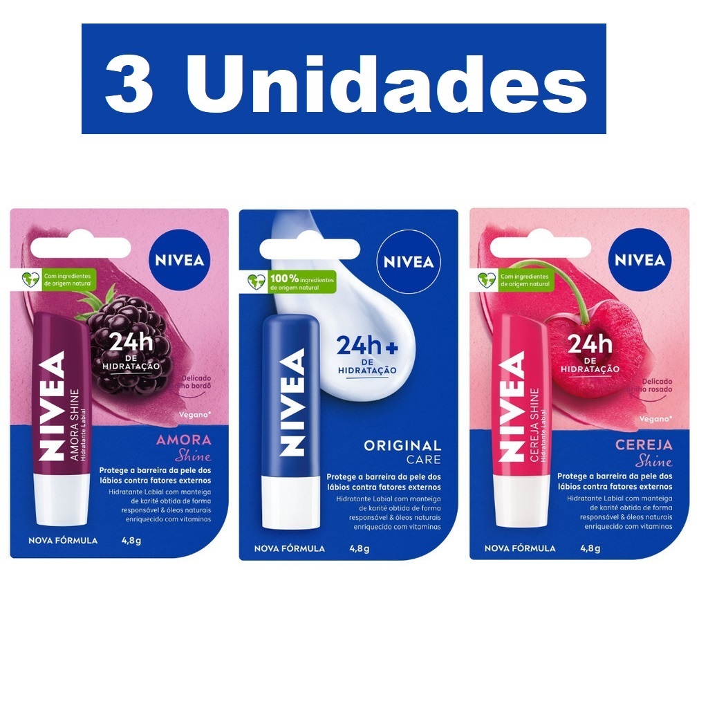 Hidratante Labial Nivea Amora Shine 4,8g + Original Care 4,8g + Cereja Shine 4,8g