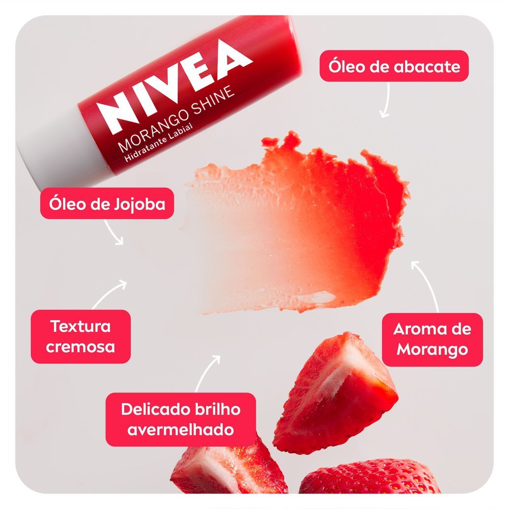 Hidratante Labial Nivea Morango Shine 4,8 g O Hidratante Labial Nivea Morango Shine é um protetor labial desenvolvido para oferecer hidratação profunda por 24 horas aos lábios. Indicado para todos os tipos de pele, proporciona uma coloração levemente avermelhada com toque de brilho, deixando os lábios macios e com aspecto saudável. Sua fórmula exclusiva contém óleos naturais e é livre de óleo mineral, garantindo uma aplicação uniforme e confortável. Benefícios Hidratação por 24 horas para lábios macios e protegidos Fórmula livre de óleo mineral, ideal para uso diário Aroma suave de morango que proporciona frescor Coloração levemente avermelhada com pigmentos brilhantes Toque de brilho que realça a beleza natural dos lábios Aplicação uniforme sem necessidade de espelho Dermatologicamente testado para segurança e eficácia Resultados Com o uso contínuo, o Hidratante Labial Nivea Morango Shine promove lábios visivelmente mais hidratados, macios e com um brilho natural. A coloração suave realça o aspecto saudável, enquanto a fórmula nutritiva protege contra o ressecamento e agressões externas. Modo de Usar Deslize o produto diretamente sobre os lábios para uma aplicação uniforme. Reaplique sempre que necessário para manter a hidratação e o brilho. Evite contato com os olhos. Uso externo. Especificações Tipo de Produto: Protetor Labial Área de Aplicação: Lábios Volume: 4,8 g Tipo de Pele: Todos os tipos de pele Indicação de Uso: Hidratação