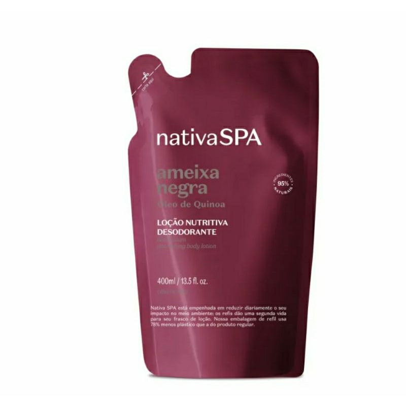 Refil Loção Desodorante Hidratante Corporal Nativa Spa O Refil Loção Desodorante Hidratante Corporal Nativa SPA entrega a reposição de sua fragrância favorita com praticidade e economia. A fórmula de Nativa SPA possui gotas 100% purificadas de quinoa, que aumentam a produção de colágeno e evitam a perda da elasticidade da pele. Como símbolo de sensualidade e intensidade, sua fragrância entrega um delicioso aroma floral oriental amadeirado. Trazendo a perfumação marcante , por meio de microcápsulas que ao longo do dia se rompem e entregam um momento de fragrância intensa para seu dia. Garantindo benefícios como: Desodorização para a pele;Hidratação o dia todo;Perfumação na medida certa. Nativa SPA está empenhada em reduzir diariamente o seu impacto no meio ambiente: os refis dão uma segunda vida para o frasco da sua loção. Nossa embalagem de refil usa 78% menos plástico que a do produto regula.
