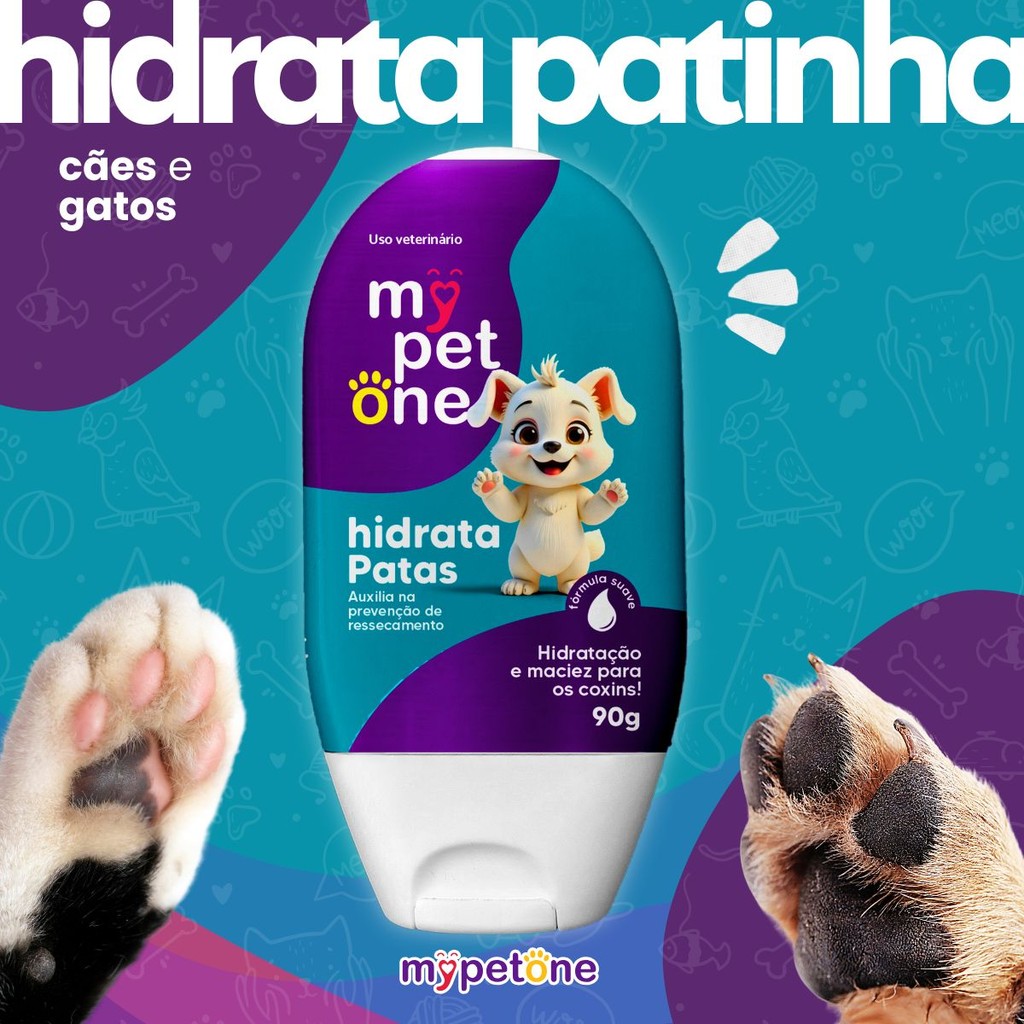 Hidrata Patinhas My Pet One – 90g Proteção, hidratação e cuidado para as patinhas do seu pet. O Hidrata Patinhas My Pet One foi desenvolvido especialmente para manter as almofadas das patas sempre macias, saudáveis e protegidas contra rachaduras, ressecamento e agressões externas como calor, frio ou pisos ásperos. Com textura leve e rápida absorção, sua fórmula segura é indicada para cães de todas as raças e idades. Ideal para uso diário ou sempre que o pet for exposto a longas caminhadas, passeios ou ambientes agressivos. Benefícios: - Hidrata e nutre profundamente as patinhas. - Previne rachaduras, ressecamento e desconfortos. - Textura suave com rápida absorção. - Fórmula segura para uso frequente. - Indicado para cães de todas as raças e idades. Modo de Uso: Com as patinhas limpas e secas, aplique uma pequena quantidade do produto e massageie suavemente até completa absorção. Pode ser utilizado diariamente ou antes/apos passeios. Evite que o animal lamba as patas até a absorção completa. Especificações Técnicas: - Apresentação: Creme hidratante - Peso: 90g - Indicação: Cães de todas as raças e idades - Uso: Externo, para aplicação nas almofadas das patas - Idade: A partir de 90 dias My Pet One – Cuidar é demonstrar amor todos os dias.