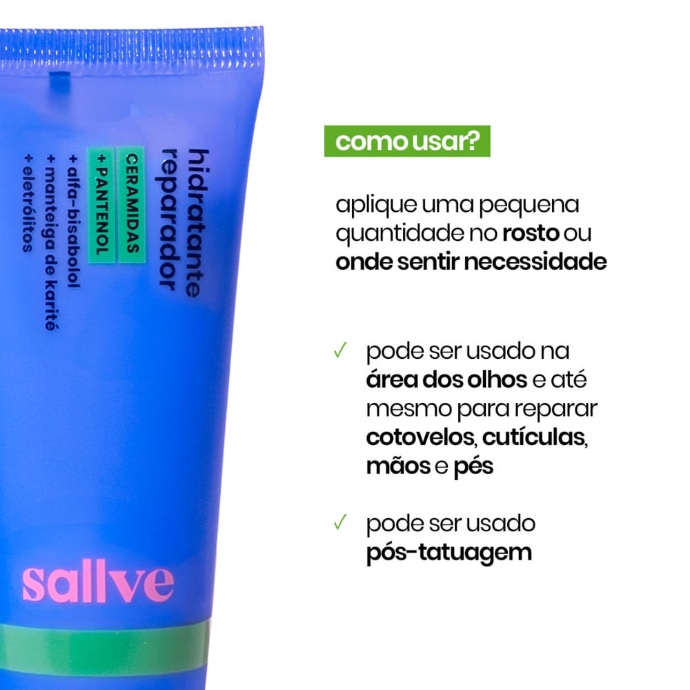 Sallve Creme Hidratante Reparador Ceramidas + Pantenol Hidratante reparador em creme com Ceramidas, Pantenol e Manteiga de Karité. nutre, repara, acalma e hidrata até as peles mais sensíveis, sensibil