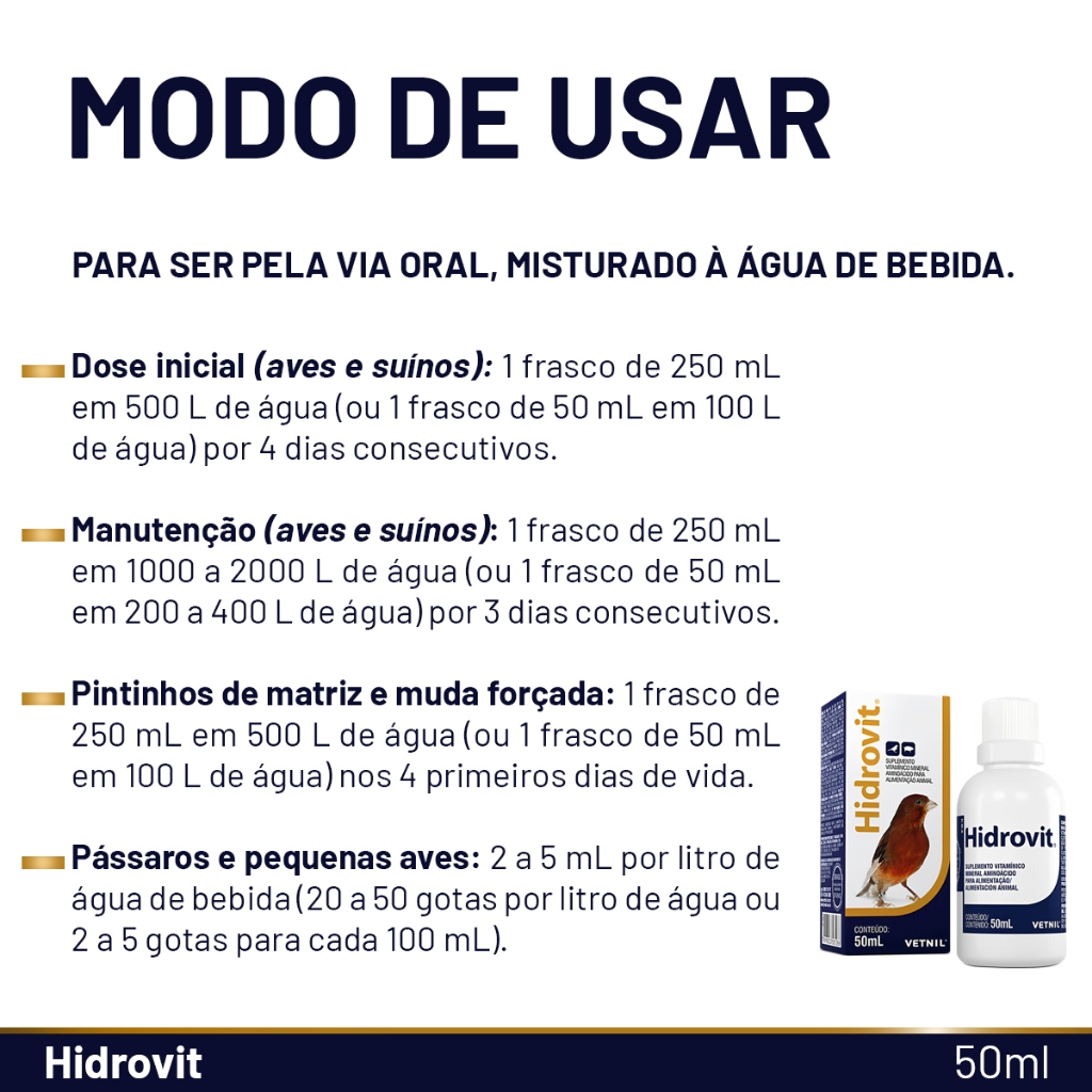 A nossa loja está a mais de 10 anos no mercado, com produtos originais e com nota fiscal. ____________________________________________________________________________ HIDROVIT SUPLEMENTO DE AVES E SUINOS - VETNIL 50ML INDICAÇAO DE USO: Hidrovit é um polivitamínico associado a aminoácidos e eletrólitos, o qual auxilia na redução das perdas decorrentes de situações de estresse, tais como: calor, transporte, vacinações e debicagens. Também é indicado para o aumento do ganho de peso inicial, evitando desuniformidade de lotes. Devido a sua composição balanceada, fornece ao lote reposição rápida dos principais nutrientes, restabelecendo o equilíbrio hidroeletrolítico das aves e suínos. MODO DE USAR Para ser usado por via oral, misturado à água de bebida. DOSE INICIAL: 1 frasco de 250mL em 500 litros de água por 4 dias consecutivos, ou 1 frasco de 50mL em 100 litros por 4 dias consecutivos. MANUTENÇÃO: 1 frasco de 250mL em 1.000 a 2.000 litros de água por 3 dias consecutivos, ou 1 frasco de 50mL em 200 a 400 litros por 3 dias consecutivos. PINTINHOS DE MATRIZ PMN E MUDA FORÇADA: 1 frasco de 250mL em 500 litros de água nos 4 primeiros dias de vida, ou 1 frasco de 50mL em 100 litros de água nos 4 primeiros dias de vida. PARA PÁSSAROS E PEQUENAS AVES: 2 a 5mL por litro de água de bebida (20-50 gotas por litro de água ou 2-5 gotas para cada 100mL). Medicamento Original ____________________________________________________________________________ Gostou? Não perca tempo, garanta já o seu!