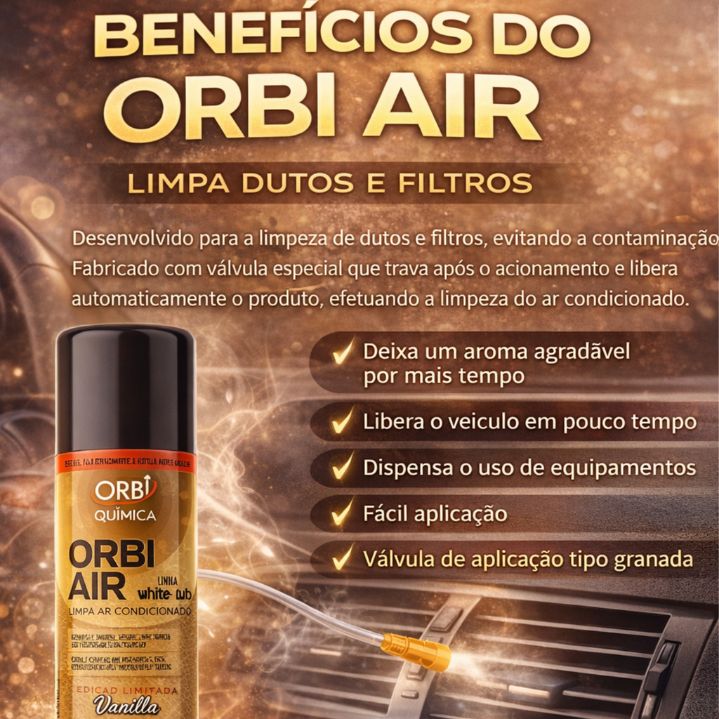 HIGIENIZADOR DE AR CONDICIONADO ORBI AIR GRANADA - 200ML PRODUTO NOVO - ORIGINAL ORBI QUÍMICA - LINHA WHITE LUB LIMPEZA PROFUNDA, ELIMINAÇÃO DE ODORES E PROTEÇÃO CONTRA FUNGOS E BACTÉRIAS. ESCOLHA O SEU AROMA PREFERIDO! Produto: Limpa Ar Condicionado (Tipo Granada / Nebulizador) Marca: ORBI QUÍMICA Linha: White Lub Conteúdo: 200 ml / 140 g Válvula: Especial com travamento automático (Granada) Quantidade: Valor referente a UMA (1) unidade. ESCOLHA A SUA FRAGRÂNCIA Disponível em 7 opções exclusivas. Selecione o aroma desejado no momento da compra: CLASSIC: Aroma tradicional e discreto. CARRO NOVO: Fragrância marcante que remete a veículo zero km. LAVANDA: Aroma floral relaxante e fresco. FLORAL: Notas suaves e envolventes. SUMMER: Edição Limitada com toque de verão. ACQUA: Edição Limitada com frescor aquático. VANILLA: Edição Limitada com notas adocicadas de baunilha. CARACTERÍSTICAS E BENEFÍCIOS Ação Integral: Sua fórmula avançada age diretamente nos dutos, na caixa de filtro e no próprio filtro de ar. Sanitização: Combate fungos e bactérias, proporcionando um ambiente mais saudável para você e sua família. Elimina Odores: Remove odores desagradáveis (mofo, cigarro, comida) e sujeiras acumuladas no sistema. Praticidade: Possui válvula especial que trava após o acionamento, permitindo a aplicação automática sem a necessidade de segurar o frasco. Rapidez: Aplicação fácil e rápida liberação do veículo. --- ATENÇÃO - MODO DE USO (TIPO GRANADA) --- PREPARO: Retire os tapetes de borracha e objetos do assoalho. Ligue o veículo. CONFIGURAÇÃO: Ligue o ar condicionado na potência máxima, ar frio e na opção RECIRCULAÇÃO (ar interno). Feche todas as janelas. APLICAÇÃO: Agite a lata. Coloque-a no assoalho do passageiro (abaixo do porta-luvas). Pressione a válvula até travar. AÇÃO: Saia do veículo e feche a porta. Deixe o produto esvaziar e circular pelo sistema por cerca de 10 a 15 minutos. FINALIZAÇÃO: Abra as janelas e deixe o carro ventilar por mais 10 minutos antes de utilizar. Desligue o motor. DESCRIÇÃO DO PRODUTO O Orbi Air Limpa Ar Condicionado é a solução definitiva para a higienização automotiva. O sistema de ar condicionado acumula umidade e sujeira, tornando-se o ambiente ideal para microrganismos nocivos. O Orbi Air atua nebulizando o ambiente, promovendo a limpeza interna do sistema e deixando uma fragrância agradável e duradoura. É saúde, conforto e proteção em uma única aplicação. PERGUNTAS FREQUENTES (FAQ) 1. Preciso trocar o filtro de cabine? Para um resultado 100% eficaz, recomenda-se trocar o filtro de ar condicionado (filtro de cabine) antes ou logo após a aplicação do produto, pois o filtro velho pode reter odores. 2. O produto molha o carro? Ele libera uma névoa seca. Porém, se aplicado muito próximo ao painel ou estofado, pode umedecer levemente. O ideal é posicionar no assoalho, direcionado para cima, onde não haja obstrução. Se ficar excesso em alguma parte plástica, basta passar um pano seco. 3. Como escolho o cheiro? Utilize o seletor de variações do anúncio para escolher entre Summer, Acqua, Vanilla, Floral, Carro Novo, Lavanda ou Classic antes de finalizar a compra. Dúvidas? Entre em contato conosco. Estamos à disposição para ajudá-lo.