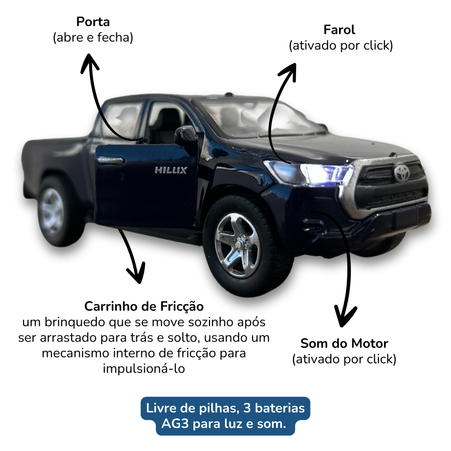 Hilux Miniatura Caminhonete Fricção Toyota Carrinho Carro Escala 1:36 c/Caixa, Som Luz Coleção Metal