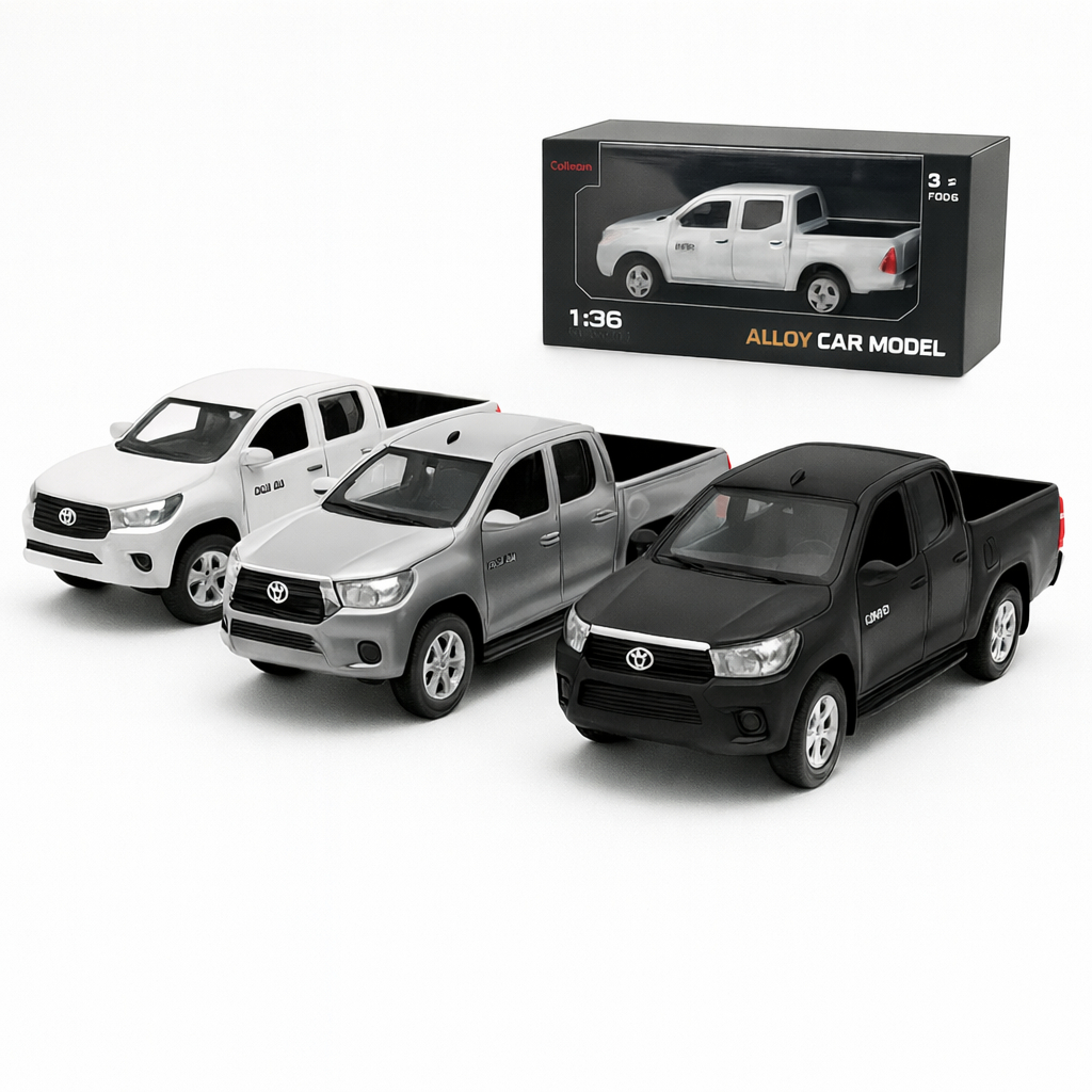 MINIATURA CAMINHONETE HILUX 1:36 C/ SOM LUZ E DISPLAY Apresentamos a Miniatura Caminhonete Hilux 1:36 com Som e Luz, um modelo die-cast premium desenvolvido para colecionadores, apaixonados por carros e crianças que adoram brincadeiras realistas. Agora em sua nova versão com display individual, o produto chega ainda mais completo, com efeitos de som de aceleração/derrapagem e luzes de farol, elevando o realismo para outro nível. Produzida em metal de alta qualidade com detalhes em plástico, esta Hilux possui portas que abrem, rodas livres e acabamento fiel aos traços da caminhonete real. É a combinação perfeita entre colecionável e brinquedo funcional. Variações Disponíveis Escolha exatamente a cor desejada: - Azul. - Cinza. - Branco. - Preto. - Kit com 3 cores (Cinza + Branco + Preto). Destaques desta nova versão - Som realista de carro acelerando e derrapando. - Luzes de farol funcionais. - Display individual (caixinha em formato vitrine). - Portas com abertura funcional. - Carroceria em metal die-cast. - Design fiel ao estilo da Hilux. - Rodas livres para brincadeira ou exposição. - Acabamento premium com ótima durabilidade. - Bateria inclusa, apenas retirar a fita branca embaixo da miniatura. Dimensões Produto - Comprimento: 11,5 cm. - Largura: 5,5 cm. - Altura: 4,0 cm. - Escala: 1:36. Material - Corpo em Metal Die-Cast. - Detalhes em Plástico ABS resistente. - Pneus de Borracha Sintética. Idade recomendada A partir de 3 anos. Conteúdo da Embalagem - 1 Miniatura Caminhonete Hilux 1:36 (cor escolhida na variação) - 1 Display individual (caixa expositora)