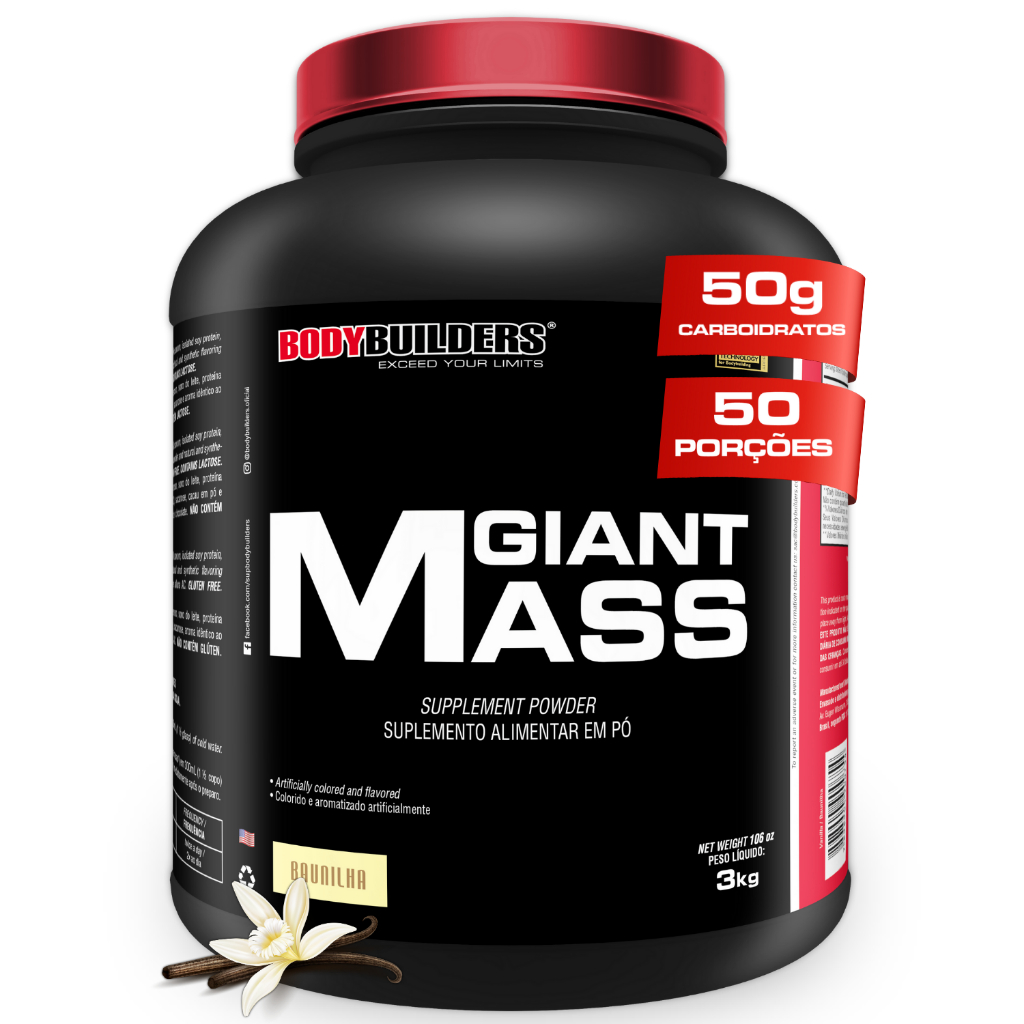 GIANT MASS – BODYBUILDERS O Giant Mass é um suplemento hipercalórico desenvolvido para complementar a ingestão calórica diária, especialmente em rotinas com alto gasto energético ou dificuldade de consumo calórico apenas pela alimentação sólida. Sua formulação combina carboidratos de rápida digestão com proteínas do soro do leite e da soja, oferecendo uma composição equilibrada para uso no pós-treino ou em outros momentos estratégicos do dia, conforme orientação profissional. Cerca de 80% da fórmula é composta por carboidratos, enquanto o restante é formado por proteínas e micronutrientes, resultando em um produto de fácil preparo e consumo. Ingredientes (variam conforme o sabor): Maltodextrina, amido de milho ceroso (waxy maize), soro do leite, proteína isolada da soja, whey protein concentrado (WPC), sacarose, aromatizantes. Sabor chocolate contém cacau em pó. Sabor morango contém corante vermelho allura AC. Alérgicos: contém derivados de leite e soja. Contém lactose. Sugestão de consumo: Adicionar 60 g (6 colheres de sopa rasas) em 300 mL de água gelada, misturar bem até completa dissolução e consumir imediatamente após o preparo. Informações adicionais: Produto indicado para adultos. O consumo deve ser ajustado de acordo com as necessidades individuais e objetivos nutricionais. Recomenda-se a orientação de um nutricionista ou profissional de saúde.