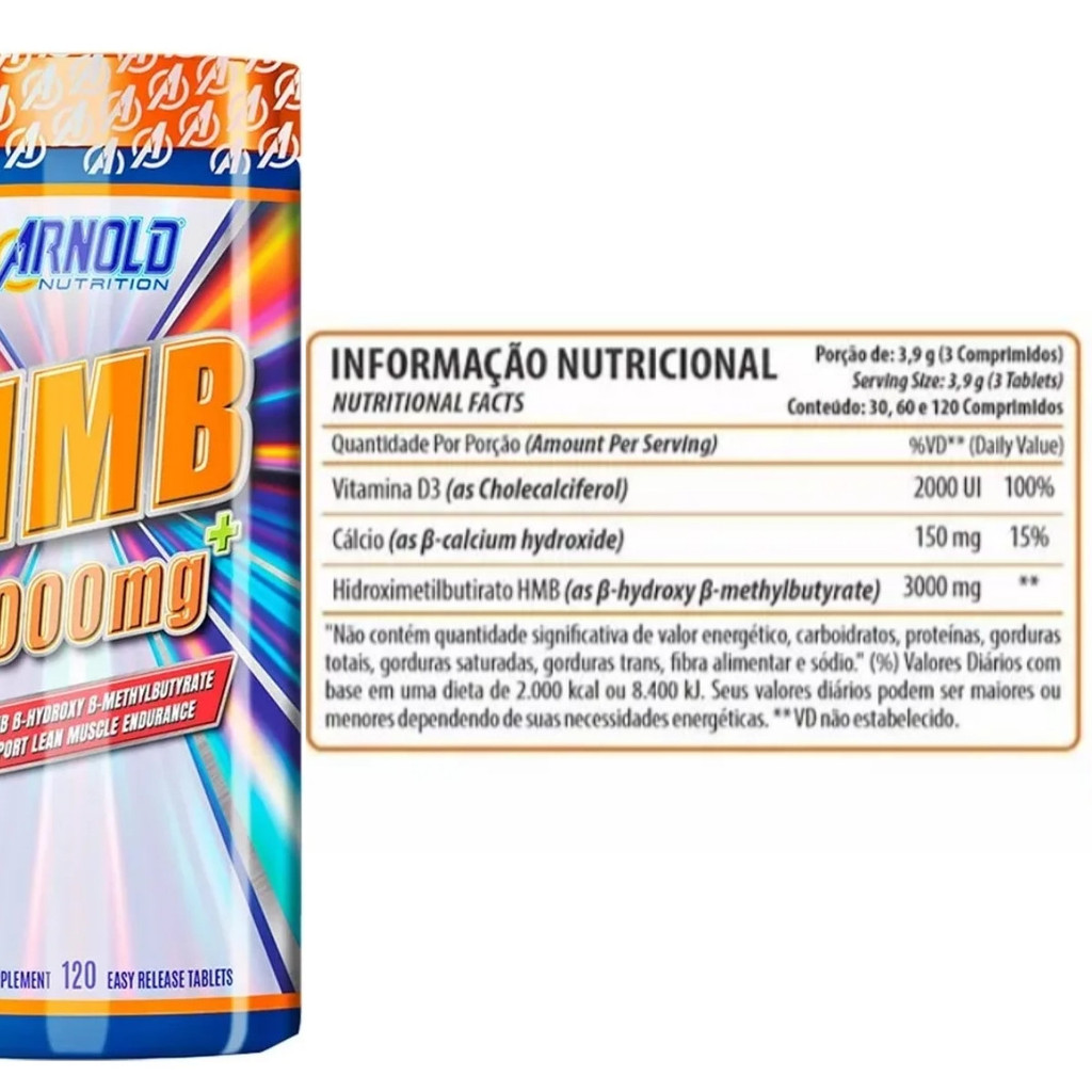 O HMB 1000mg da Arnold Nutrition é um suplemento alimentar que fornece HMB (ß-Hidroxi ß-Metilbutirato), um metabólito do aminoácido essencial L-Leucina, associado à manutenção da estrutura muscular. A combinação com Vitamina D3 contribui para o suporte ao funcionamento normal dos músculos e à saúde óssea. Composição e Ingredientes: - HMB (ß-Hidroxi ß-Metilbutirato), Vitamina D3, excipientes. - Não contém glúten. Sugestão de Uso: - Consumir 1 a 3 cápsulas ao dia, preferencialmente antes das principais refeições, ou conforme orientação de médico ou nutricionista. Informações Técnicas: - Porção: 1 cápsula - Quantidade: conforme embalagem - Indicação: uso adulto Armazenamento: - Manter o produto em sua embalagem original, bem fechado, ao abrigo de luz, calor e umidade. Após aberto, consumir em até 30 dias. Avisos Importantes: - Produto indicado para maiores de 19 anos. - Este produto não é um medicamento. - Não exceder a dose recomendada. - Não substitui uma alimentação equilibrada. - Consumir junto com alimentos para melhor assimilação.