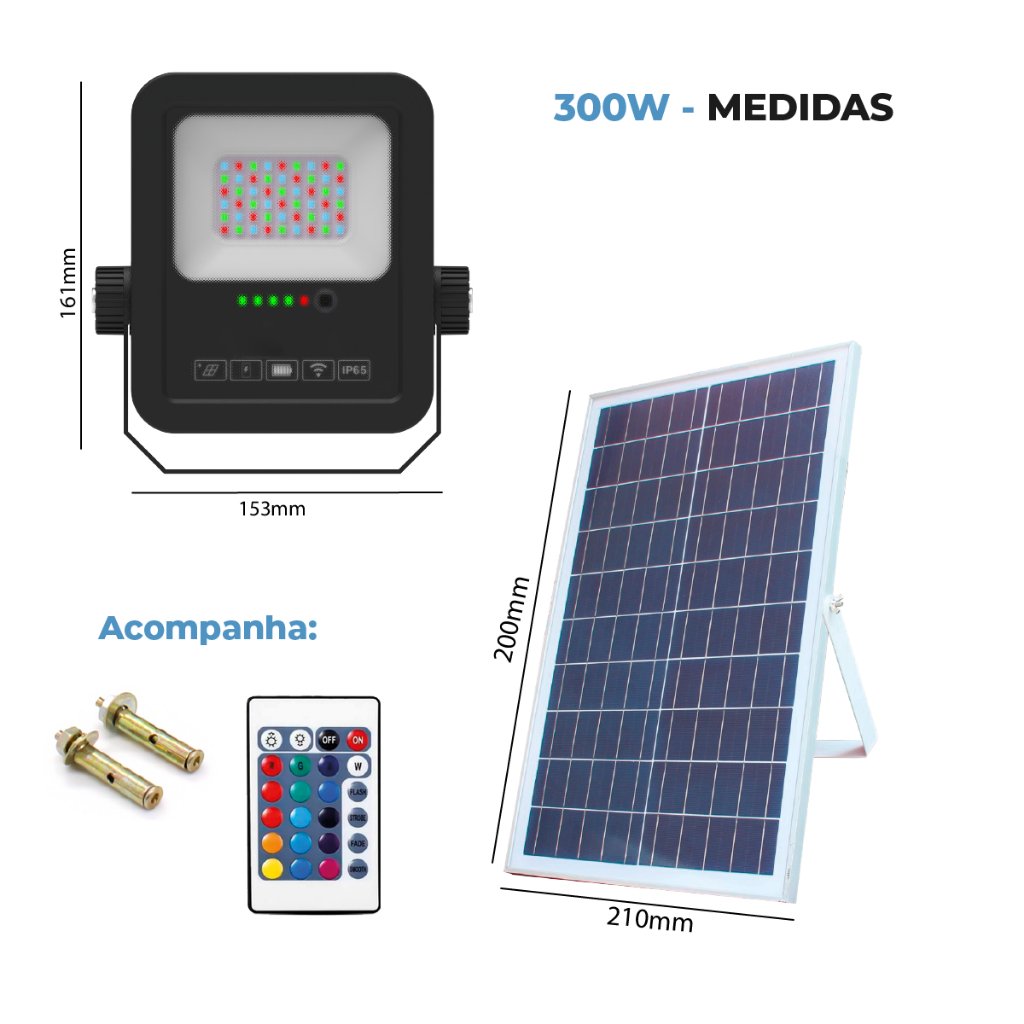 💡 Holofote Refletor LED RGB Solar 300W | 500W | 1000W – Prova D'Água | Com Placa Solar | Para Ambientes Externos 💡 Ilumine seu espaço com um show de cores e sustentabilidade! Este holofote LED RGB solar é ideal para fachadas, jardins, piscinas e áreas externas, proporcionando iluminação vibrante e eficiente. Destaques do Produto: • Disponível em 3 potências: 300W, 500W ou 1000W para atender diferentes necessidades. • Iluminação RGB: Escolha entre diversas cores para criar o ambiente perfeito. • Energia Solar: Funciona sem fios, sem consumo de eletricidade e com autonomia prolongada. • Resistência e Durabilidade: Classificação IP65, resistente à chuva e poeira, ideal para áreas externas. • Fácil Instalação: Acompanha placa solar, controle remoto, parafusos e suporte para fixação. • Dimensões do Refletor 300W: 161 x 153 mm | Placa Solar 300W: 200 x 210 mm. • Dimensões do Refletor 500W: 199 x 192 mm | Placa Solar 500W: 300 x 205 mm. • Dimensões do Refletor 1000W: 248 x 232 mm | Placa Solar 100W: 230 x 190 mm. • Econômico e Sustentável: Iluminação de longa duração com energia renovável. ⚠️ ATENÇÃO: O título "Kit 2" não influencia na quantidade enviada. Escolha a quantidade desejada (1 até 2 peças) nas variações abaixo. 📦 Entrega rápida + Nota Fiscal!