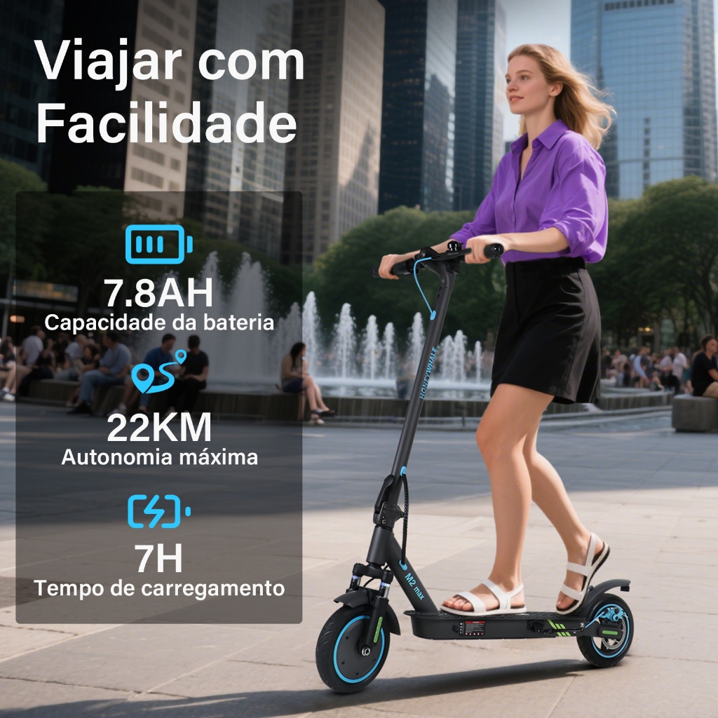 Para sua segurança, o patinete elétrico M2 MAX possui sistema de partida não-zero. Ou seja, é necessário dar um pequeno impulso com o pé antes de pressionar o acelerador para o motor entrar em funcionamento. Velocidade de cruzeiro: Ao atingir uma velocidade constante, mantenha o acelerador pressionado por 6 segundos até ouvir um sinal sonoro indicando que o modo de cruzeiro foi ativado. Para desativar, basta tocar no freio ou acelerar novamente. Especificações do Patinete Elétrico: 1.Modelo: M2 MAX 2.Voltagem de saída: 36V 3.Capacidade da bateria: 7.8AH 4.Tempo de carga: 7 horas 5.Potência do motor: 350W nominal, 500W potência máxima 6.Tamanho do pneu: 8.5 polegadas 7.Tipo de pneu: Pneus infláveis 8.Nível de impermeabilidade: IPx4 9.Velocidade máxima: 32 km/h 10.Autonomia: até 22 km 11.Suporta até: 120 kg 12.Material: Liga de alumínio 13.Sistema de freio: Freio a disco + freio eletrônico 14.Tela: Bateria / Quilometragem / Velocidade / Marcha Destaques do Produto: 1.Aplicativo com conectividade Bluetooth 2.Modo de cruzeiro inteligente 3.Luzes de seta nos dois lados 4.Tela LCD digital de alta definição 5.3 modos de velocidade: 1-15KM/H, 2-25KM/H, 3-32KM/H Dimensões: Dimensões abertas: 110*48*120 cm Dimensões dobradas: 110*48*58 cm Peso líquido: 13kg Um patinete elétrico ideal para o dia a dia: O patinete elétrico adulto M2 MAX vem com motor potente de 500W, permitindo atingir até 32KM/H. Sua bateria de íons de lítio de 7.8AH oferece uma autonomia de até 22KM com uma única carga, sendo perfeito para deslocamentos urbanos rápidos sem se preocupar com trânsito. Segurança reforçada: Com sistema de freios duplo (freio a disco + eletrônico), o patinete juvenil oferece uma frenagem rápida e estável. Conta ainda com amortecedores dianteiros e traseiros que absorvem impactos, além de luz frontal e lanterna traseira que acende ao frear, garantindo mais segurança à noite. Condução confortável e segura: Os pneus infláveis de 8.5 polegadas garantem melhor aderência e absorção de impacto. O patinete acompanha câmara de ar extra, extensor de válvula e alavanca de pneus. As luzes de seta nos dois lados do guidão tornam sua direção mais segura e visível. Patinete multifuncional com tecnologia: Com 3 modos de velocidade e uma tela LCD digital, você pode visualizar informações como nível da bateria, velocidade atual e modo de condução. Ideal como scooter elétrica adulto ou patinete adulto para quem busca controle total. Conectividade via App: O scooter elétrica M2 MAX possui conectividade Bluetooth com aplicativo para personalizar funções e acompanhar o estado do veículo em tempo real. O modo padrão é de partida com impulso (não-zero), exigindo um leve empurrão com o pé antes de acelerar. Aviso legal • Idade mínima recomendada: 16 anos