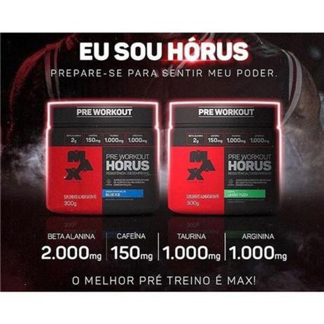 O QUE É HORUS (300G) MAX TITANIUM Horus (300g) Max Titanium é um produto para ser consumido no pré treino. Para quem se exercita com intensidade, a fadiga é um dos principais fatores que influenciam o rendimento, por isso desenvolvemos o HÓRUS: com formulação altamente tecnológica e ingredientes de altíssima qualidade, para você ter um treino com muito mais eficiência. * Antes do consumo, sugerimos que leia atentamente a embalagem. Todas as informações sobre produtos possuem apenas propósitos educativos e não tem a intenção de substituir diagnósticos, prescrições ou orientações profissionais. Imagem meramente ilustrativa. sku: 706337 TABELA NUTRICIONAL Blue Ice Ingredientes: Isomaltulose, beta-alanina, L-arginina, taurina, cafeína, aromatizantes, edulcorante sucralose, antiumectante dióxido de silício e corantes artificiais indigotina e azul brilhante fcf. NÃO CONTÉM GLÚTEN. Limão Yuzu Ingredientes: Beta-alanina, isomaltulose, L-arginina, taurina, cafeína, aromatizantes, acidulante ácido cítrico, edulcorante sucralose, antiumectante dióxido de silício e corantes artificiais tartrazina (INS 102) e azul brilhante fcf. NÃO CONTÉM GLÚTEN. COMO TOMAR HORUS (300G) MAX TITANIUM 1. Diluir 1,2g (1/5 dosador) em 40mL de água gelada. 2. Diluir 8,4g (1 e ½ dosador) em 300mL de água gelada, guardar em recipiente bem fechado e consumir 40mL a cada 2 horas. Tomar 1 dose de 8,4g ao dia dividida em 7 porções de 1,2g (1/5 dosador), com intervalo de duas horas entre as porções. Atenção: Utilizar porções de, no máximo 1,2g (1/5 dosador), com intervalo de duas horas entre as porções. BENEFÍCIOS - Pré Workout; - Resistência; - Desempenho; - Beta Alanina 2g; - Taurina 1.000mg; - Arginina 1.000mg; - Cafeína 150mg: auxilia no aumento do estado de alerta e na melhora da concentração;