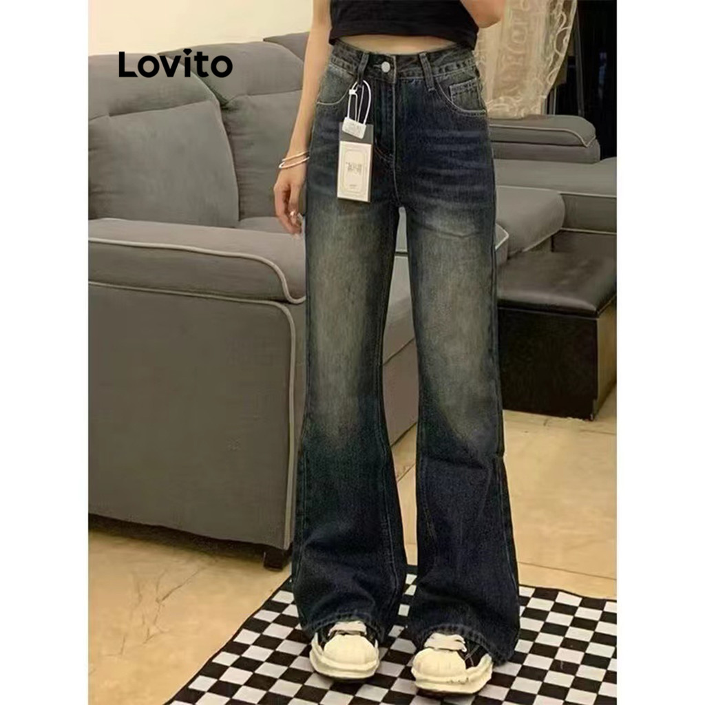 (Hot) Lovito Casual Calça Jeans Feminina Lisa com Zíper LNA34035 (Multicolorido)