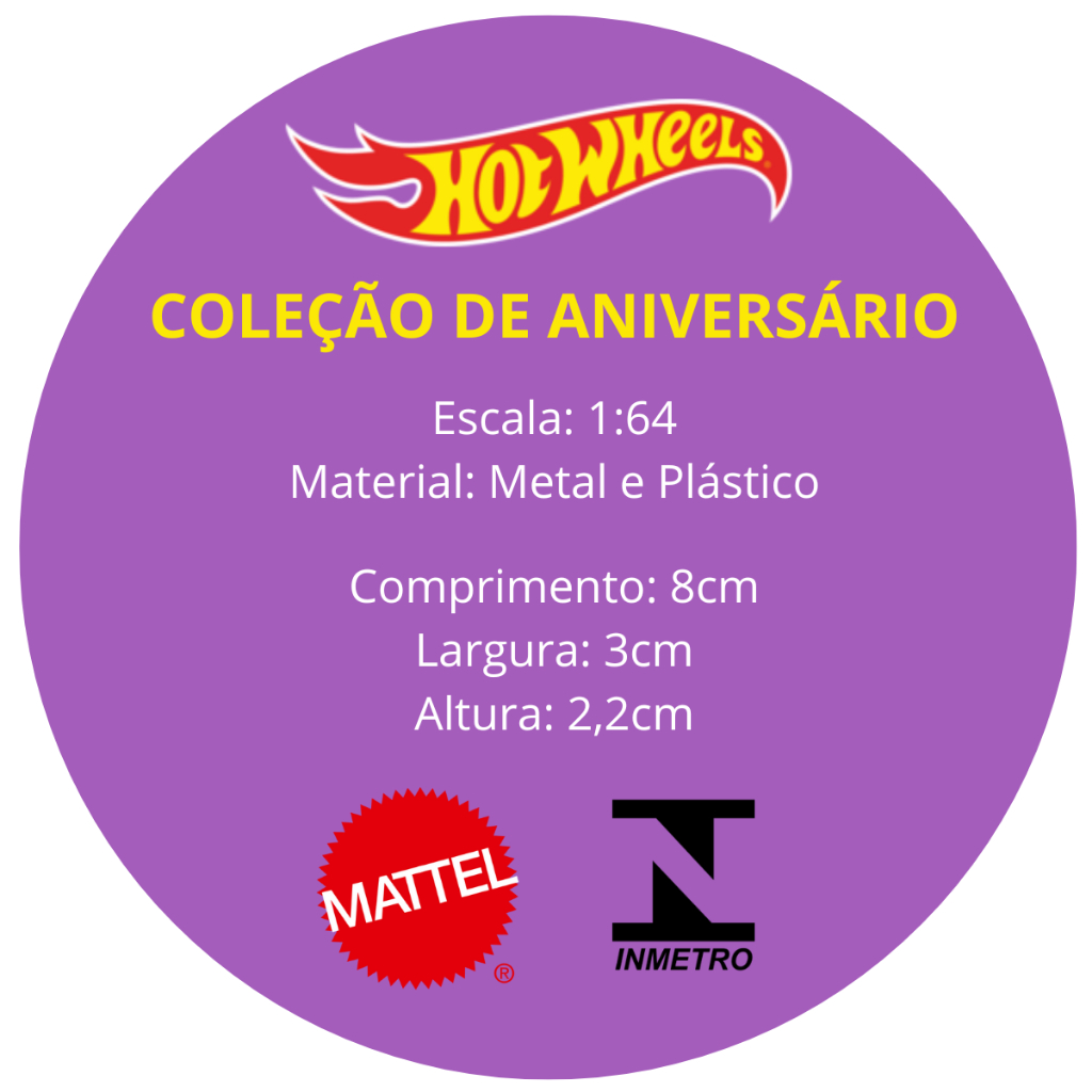 Carrinhos em miniaturas originais Hot Wheels Coleção de Aniversário com garantia de fábrica. Os modelos são vendidos separadamente. Especificações do Produto: ➢Fabricante: Mattel ➢Marca: Hot Wheels ➢Certificação: Inmetro ➢Escala aproximada: 1:64 ➢Linha: Coleção de Aniversário ➢Material: Metal e Plástico G2 Brinquedos e Colecionáveis ✔ Produtos Originais: Só trabalhamos com miniaturas oficiais com garantia de fábrica. ✔ Envio Rápido e Seguro: Seu pedido é despachado em até 1 dia útil, (exceto feriados). ✔ Embalagem com lacre de segurança, plástico bolha, caixa reforçada, deixando assim sua encomenda mais segura e protegida. ✔ Atendimento de Colecionador para Colecionador: Sabemos o quanto cada peça é especial. Cuidamos de cada envio como se fosse para nossa própria coleção. 🚗✨ Obrigado por visitar a G2 Brinquedos e Colecionáveis. Conte com a gente para aumentar sua coleção com confiança e tranquilidade!