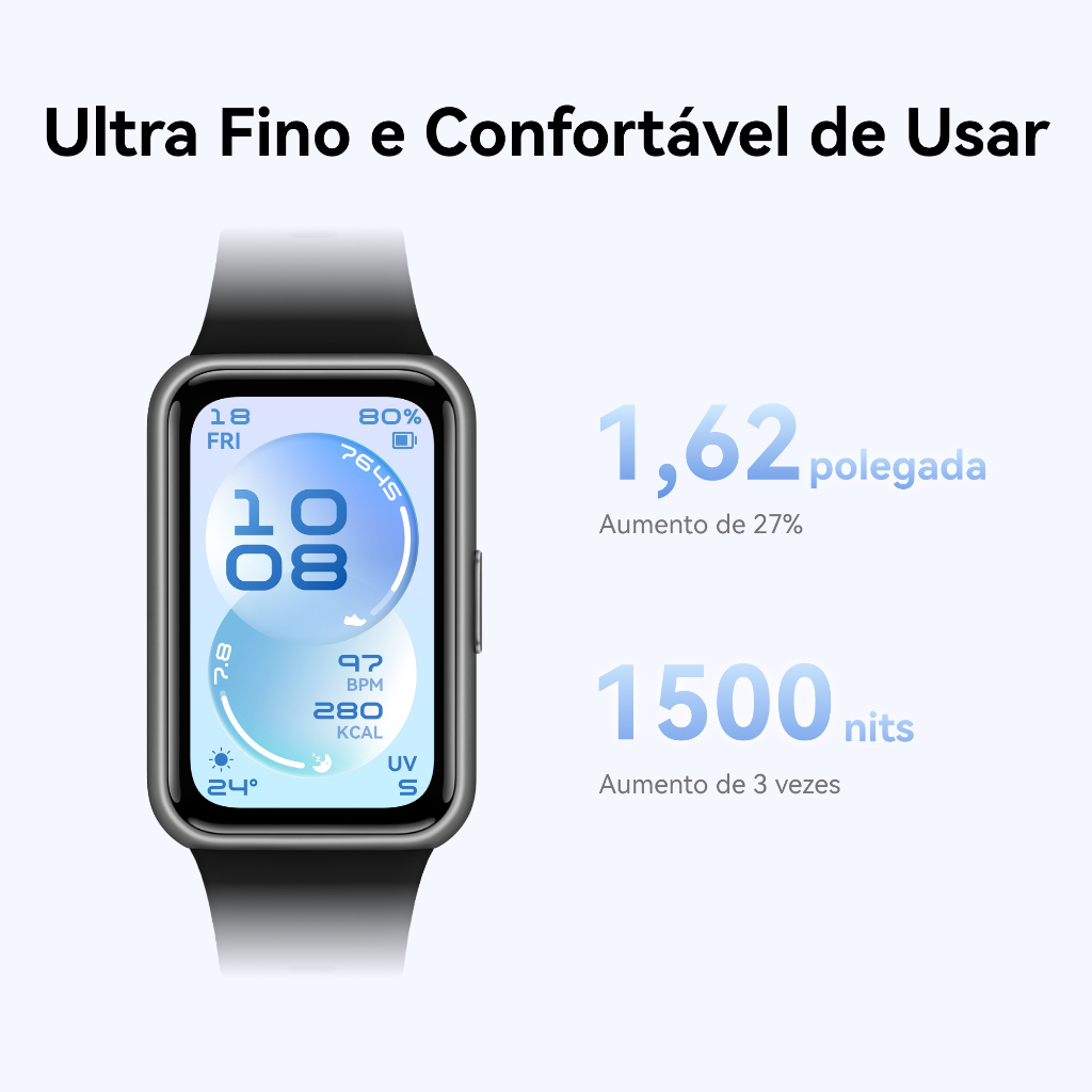 Tela de Alta Luminosidade de 1,62 polegadas: A tela AMOLED de 1,62" e 60 Hz é 27% maior(7) e substancialmente mais brilhante, com até 1500 nits. Tudo fica claro à primeira vista, mesmo sob o sol forte. Com 16 g, é fácil esquecê-lo. Com uma caixa de materiais poliméricos duráveis de 8,99 mm(5) , ele proporciona um visual moderno e uma sensação natural. Uma Bateria Robusta de 300 mAh para Seus Dias e Noites: Até 8 dias(16) de uso normal com uma carga completa, Até 14 dias(16) de uso moderado com uma carga complete, *AOD ativado: 3 dias16 de autonomia da bateria. Monitoramento Aprimorado do Sono(1): Saiba mais sobre sua recuperação através da variabilidade da frequência cardíaca (VFC / HRV) média durante o sono.(1) Acompanhe-a junto com a frequência cardíaca e a SpO2 e receba alertas quando elas estiverem fora dos seus limites pessoais. Bem-estar Emocional Multidimensional(2): Você poderá visualizar seu estado emocional na forma de 12 estados florais.(2) Durante todas as mudanças de humor, observe seus amigos fofinhos que se contorcem, dançam e alegram você no mostrador.(13) Compatível com iOS e Android.(4): Amplamente compatível. Cerca de 100 treinos(3), desde ioga e treino de força até pular corda. Acesse os cursos para explorar mais movimentos e diversão. Uma Variedade de Recursos Prontos para Usar: Indispensável para selfies. Acompanhe sua agenda, com lembretes para os próximos compromissos.(10) Receba notificações de mensagens ou chamadas diretamente no seu pulso.(11) Toque para recusar as chamadas ou responder com mensagens predefinidas. Diâmetro Aplicável do Pulso: Preto (Polímero): 130 - 210 mm Roxo (Polímero): 120 – 190 mm Preto (Metal): 130 - 210 mm Peso: Roxo, preto (caixa em materiais poliméricos duráveis): aproximadamente 16 g (sem considerar o peso da pulseira) Preto (caixa em materiais metais): aproximadamente 16 g (sem considerar o peso da pulseira) Conteúdo da Caixa: HUAWEI Band 11 × 1 Cabo de carregamento × 1 Guia do Usuário, Informações de Segurança e Cartão de Garantia × 1