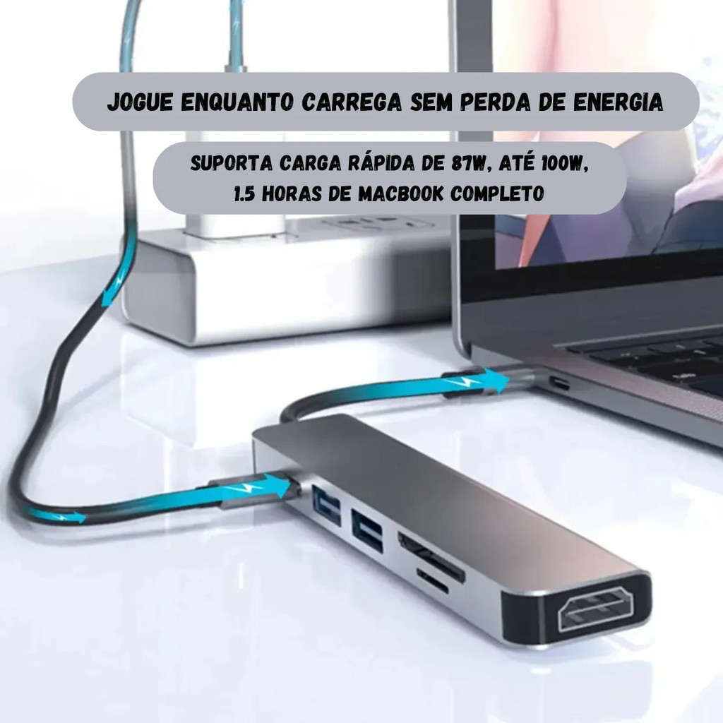 Experimente o Hub 6 em 1, a solução definitiva para potencializar a versatilidade do seu MacBook ou qualquer notebook de última geração! Este hub exclusivo oferece uma experiência de conectividade incomparável, com entradas 4K30Hz para proporcionar imagens nítidas e vibrantes. Além disso, você poderá carregar seu dispositivo rapidamente com a porta PD, transferir dados de maneira eficiente com as portas USB 3.0 e 2.0, e ainda ter acesso fácil aos seus cartões SD e TF. Com um design elegante e compacto, o Hub 6 em 1 é a escolha perfeita para quem busca conveniência, estilo e funcionalidade em um único dispositivo. Simplifique sua vida digital e leve a experiência do seu notebook a um novo patamar! Interface: 6 em 1: 4K30Hz + PD + SD + TF + 1 * USB3.0 + 1 * USB2.0 + 1 * Tipo C indicado para notbook e macbook Parâmetros do produto Nome: Tipo C interface hub multifuncional Material: alumínio liga Interface PD: suporta carregamento 100W. Tipo interface: transmissão dos dados Interface USB: USB 3.0 para usufruir melhor do produto e todas as capacidades indicamos usar em notbook/macbook/computadores Resolução HD: 4K * 2K Slot para cartão SD/TF: câmera/leitura do cartão de memória