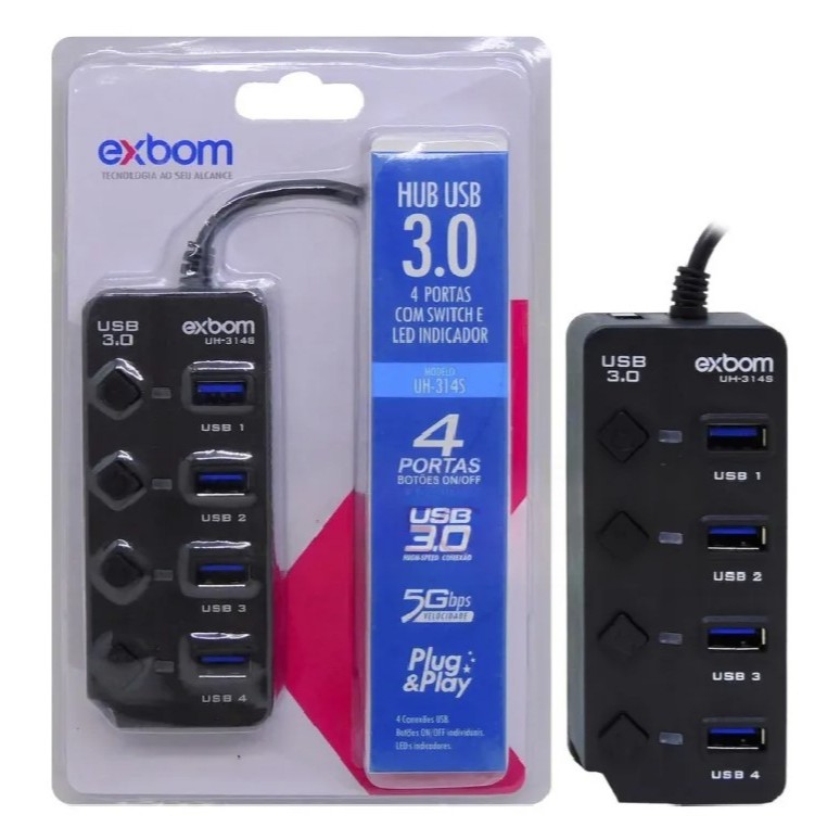 Expanda a conectividade do seu notebook ou PC com o Hub USB 3.0 Exbom UH-314S. Com 4 portas USB de alta velocidade, botões independentes liga/desliga e LEDs indicadores, você tem mais controle, praticidade e organização no seu ambiente de trabalho ou lazer. Especificações Técnicas: Modelo: UH-314S Número de portas: 4 portas USB 3.0 Tipo-A Velocidade de transferência: Até 5Gbps (SuperSpeed USB 3.0) Botões físicos ON/OFF para cada porta Indicadores LED individuais, mostrando status de cada porta Compatibilidade: Windows, macOS, Linux e outros sistemas com suporte a USB Plug & Play: Não requer instalação de drivers Material: Plástico ABS de alta resistência Alimentação: USB direto do dispositivo host Cor: Preta