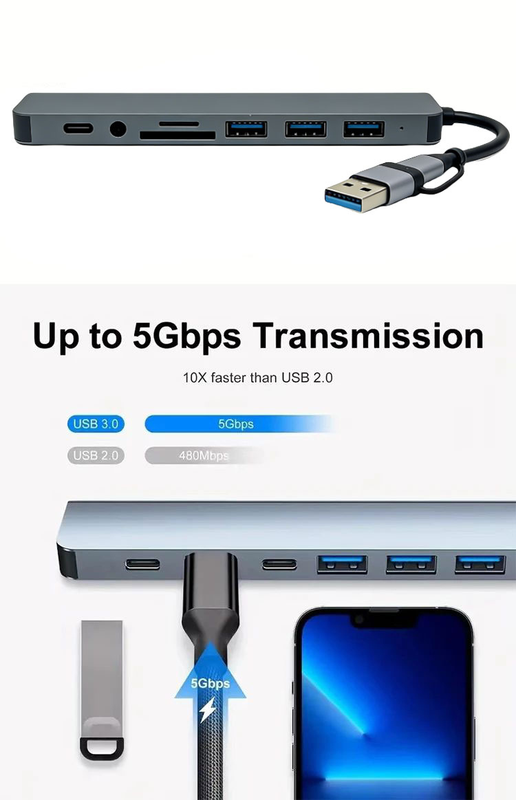 Hub USB 8 Em 2 Para MacBook Splitter TF Leitor De Cartão SD Porta-C Estação De Acoplamento 3.0