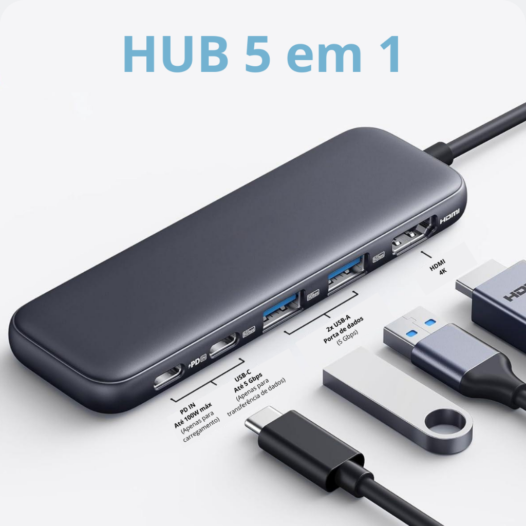 Descomplique seu setup com o Dapon DP1338, um hub USB-C 5 em 1 elegante e compacto que traz HDMI 4K, carregamento rápido e transferência de dados ultrarrápida - tudo num único acessório. Ideal para MacBook, Dell, Lenovo ou HP. Design premium, compatibilidade garantida e pronto para elevar sua produtividade. Tudo em um so produto: Elimine cabos e adaptadores extras com um hub compacto e funcional. Produtividade eficiente: Carregue, transfira dados e expanda sua tela simultaneamente. Energia continua: O modo pass-through garante que seu dispositivo não descarregue durante o uso. Design premium e moderno: Perfeito para ambientes profissionais e criativos. Destaques: Design compacto e sofisticado; estrutura em alumínio que dissipa calor; acabamento leve e ideal para viagens ou uso diário. Conectividade completa 5 em 1: - 1 HDMI 4K 30 Hz - espelha ou amplia sua tela, ideal para apresentações, videos ou home office. - 1 USB-C dados (ate 5 Gbps) - ideal para HDs externos ou transferência ultrarrápida de arquivos. - 2 USB-A dados (ate 5 Gbps cada) - conecte pendrives, periféricos ou HDs com maxima velocidade. - 1 entrada USB-C PD (Power Delivery) - suporta carregamento pass-through de ate 85 W, mantendo seu notebook energizado. Compatibilidade ampla: Ideal para MacBook Pro/Air, Dell XPS, Lenovo ThinkPad, notebooks HP e outros dispositivos USB-C com video (DisplayPort Alt-Mode ou Thunderbolt). Especificações técnicas: HDMI: 4K 30 Hz (espelho e estendido) USB-C dados: ate 5 Gbps USB-A (2x): ate 5 Gbps cada Entrada USB-C PD: 100 W entrada -> 85 W saída Material: alumínio com cabo reforçado Compatibilidade: notebooks USB-C com video Observação: portas USB-C de dados não transmitem video Atenção importante: A função HDMI exige que o dispositivo suporte DisplayPort Alt-Mode ou Thunderbolt via USB-C. A entrada PD requer carregador compatível (não incluso). A potencia util de saída e cerca de 85 W; notebooks com consumo maior podem apresentar recarga lenta ou aviso de carga.