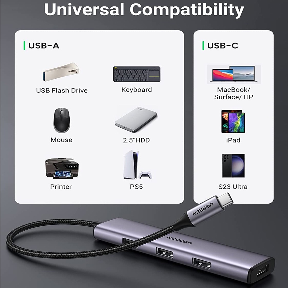 Hub Adaptador Ugreen Usb C p/4 Porta Usb 3.0 Alta Velocidade Ugreen Hub Adaptador Usb-C para 4 Portas Usb 3.0 de Alta Velocidade Adaptador Compacto e Eficiente Compatível com MacBook PC Laptop, Celulares e Outros Dispositivos com Usb C - no Brasil Expansão eficiente: Transforme uma única porta USB-C em 4 portas USB 3.0, possibilitando a conexão de diversos dispositivos como teclado, mouse, pendrive, HD externo e outros, tudo isso sem sacrificar a velocidade de transferência; Alta velocidade: As portas USB 3.0 oferecem velocidades de transferência de até 5 Gbps, proporcionando um desempenho 10 vezes mais rápido do que o USB 2.0, permitindo transferir arquivos grandes em poucos segundos; Compatibilidade ampla: Compatível com dispositivos USB-C como MacBook, Chromebook, laptops, PCs, celulares e tablets, o hub UGREEN USB-C se adapta perfeitamente às suas necessidades e é ideal para uso no trabalho ou em casa; Design compacto e portátil: O adaptador UGREEN USB-C para 4 portas USB 3.0 possui um design leve e compacto, facilitando o transporte e garantindo que você possa expandir a conectividade do seu dispositivo onde estiver; Plug and Play: Não é necessário instalar drivers ou software, basta conectar o hub USB-C ao seu dispositivo e começar a utilizar imediatamente. O indicador LED informa o status de conexão e funcionamento. Garantia: 90 dias.
