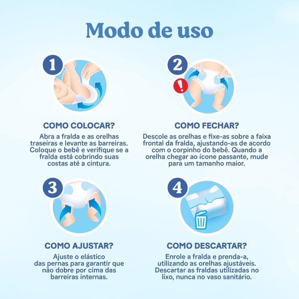 Sobre este item MÁXIMA PROTEÇÃO ANTI-VAZAMENTO: Mantenha seu bebê sequinho e protegido com nossa avançada tecnologia de absorção, criada para evitar vazamentos durante todo o dia e a noite; PROTEÇÃO ESPECIAL DE ATÉ 12 HORAS: Protege a pele delicada do bebê contra assaduras por até 12 horas. Além da maciez, são hipoalergênicas, sem parabenos e fragrâncias, garantindo mais segurança; LIBERDADE DE MOVIMENTO: A cintura, orelhas e barreiras elásticas proporcionam liberdade para a movimentação do bebê ao longo do dia e da noite; ABSORÇÃO REFORÇADA: Com canais que absorvem em segundos, garante uma proteção total para o bebê. Mais absorção graças às barreiras duplas anti vazamento e ao centro reforçado; QUALIDADE HUGGIES: Conforto e tecnologia sempre juntas para oferecer ao seu bebê liberdade e segurança em todo momento.