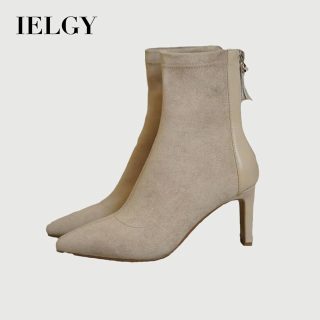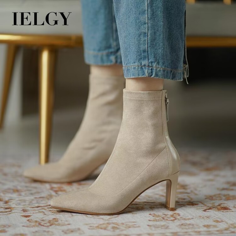 IELGY Apricot Botas Francesas Femininas De Camurça Com Salto Grosso E Cano Médio