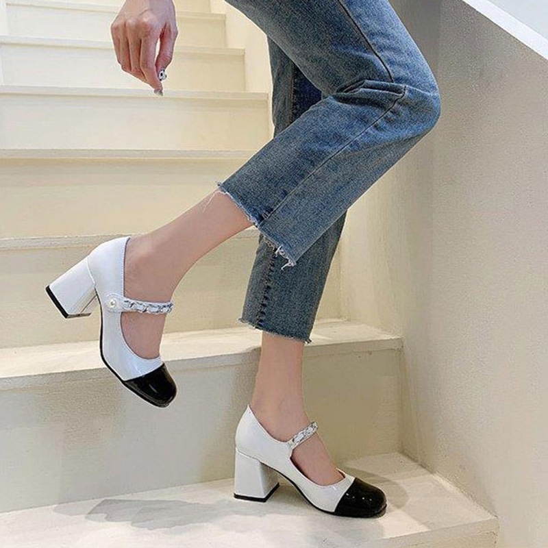 IELGY Preto E Branco Cor Combinando retro Pequena Fragrância Estilo Dedo Do Pé Quadrado Salto Grosso