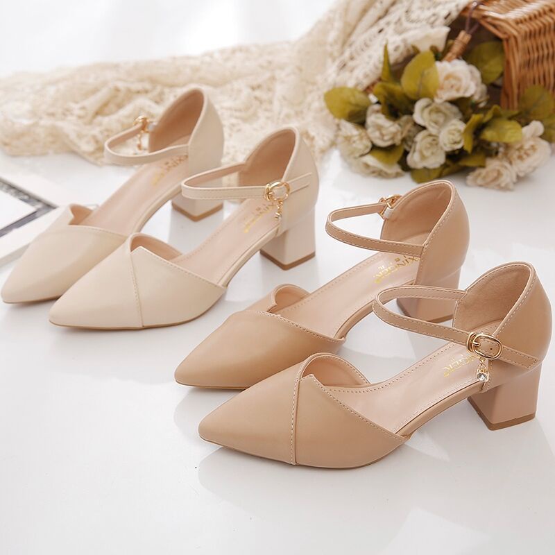 IELGY Sandália Feminina De Couro Flexível Bico Fino Salto Grosso Fivela