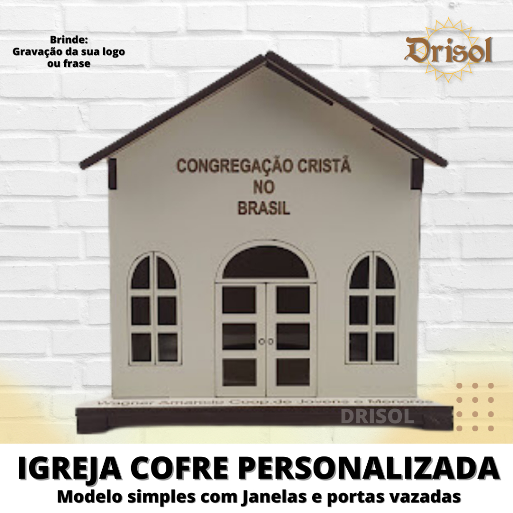 Deixe sua programação, evento ou escolinha biblica ou Sabatina com um momento especial usando nossas igrejinhas cofres para recolher ofertas ou pedidos de oração. Nossas Igrejinhas são feitas em MDF 3mm com a Face de fora laminada em Branco Off White. Você pode fazer 1 personalização na frente sem custo adicional. Temos algumas logos de Igrejas disponíveis, ou voce pode enviar o que deseja, podendo ser um pequena frase ou nome. As igrejas vão desmontadas, para enviar danificar no transporte. Mas fique tranquila a montagem é bem simples, ela tem encaixes e voce finaliza usando cola Instantânea (super bond) ou cola Branca. Nosso prazo para fabricação é até 5 dias úteis + prazo do correio que é informado no ato da compra. Após a compra entre em contato pelo Nosso CHAT e passe o nome ou logo que deseja personalizar gratuitamente!