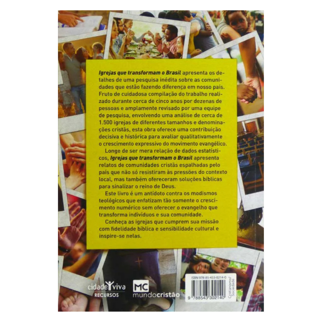 Igrejas que transformam o Brasil apresenta os detalhes de uma pesquisa inédita sobre as comunidades que estão fazendo diferença em nosso país. Fruto de cuidadosa compilação do trabalho realizado durante cerca de cinco anos por dezenas de pessoas e amplamente revisado por uma equipe de pesquisa, envolvendo uma análise de cerca de 1.500 igrejas de diferentes tamanhos e denominações cristãs, esta obra oferece uma contribuição decisiva e histórica para avaliar qualitativamente o crescimento expressivo do movimento evangélico. Longe de ser mera relação de dados estatísticos, Igrejas que transformam o Brasil apresenta relatos de comunidades cristãs espalhadas pelo país que não só resistiram às pressões do contexto local,mas também ofereceram soluções bíblicas para sinalizar o reino de Deus. Este livro é um antídoto contra os modismos teológicos que enfatizam tão somente o crescimento numérico sem oferecer o evangelho que transforma indivíduos e sua comunidade. Conheça as igrejas que cumprem sua missão com fidelidade bíblica e sensibilidade cultural e inspire-se nelas. 14x21cm 256 Páginas