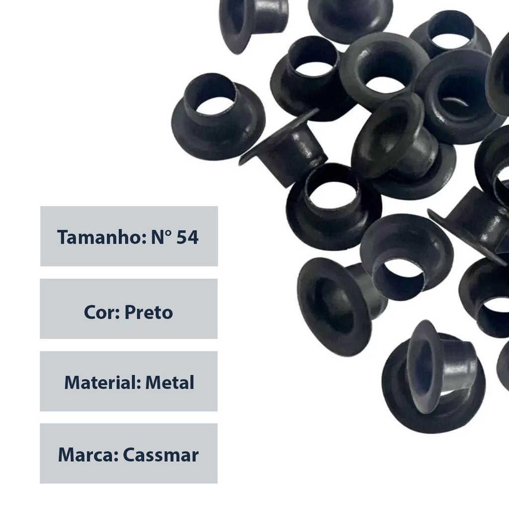 ILHÓS DE METAL PRETO N°54 CASSMAR 100 UNIDADES O ilhós é um pequeno e versátil dispositivo, empregado em várias aplicações e produtos. Sua principal utilidade é reforçar orifícios ou aberturas em materiais flexíveis, como tecidos, lonas, couro, plástico e até mesmo papel. Normalmente, consiste em um anel metálico ou de plástico resistente com um orifício central, que é inserido no material a ser fortalecido. A função primordial do ilhós é fortificar a borda do orifício, prevenindo rasgos ou desgaste prematuro do material. Além disso, ele pode ser usado como ponto de ancoragem para passagem de cordões, cadarços, correntes ou outros tipos de conexões, permitindo uma fixação segura do material por amarração, fixação ou suspensão. Ilhós são frequentemente encontrados em uma ampla gama de produtos, incluindo encadernações, vestuário, calçados, bolsas, mochilas, lonas para toldos e tendas, banners, cortinas de chuveiro e muitos outros itens que necessitam de reforço ou de um ponto de fixação. Eles estão disponíveis em várias cores e tamanhos, o que os torna versáteis para se adaptarem a diferentes necessidades de design e estilo. O ilhós também podem ser usados como decoração em alguns produtos, conferindo um toque estético e moderno. Portanto, desempenham um papel importante tanto na resistência quanto no design de muitos itens de uso diário. -------------------------------------------------------------------------------------------- UTILIZAÇÃO DO ILHÓS - Pode ser utilizado para: - Scrapbook - Patchwork - Encadernação - Corte e costura - Artesanatos em geral ------------------------------------------------------------------------------------- CARACTERÍSTICAS DO PRODUTO: - Marca: Cassmar - Tamanho: N° 54 - Cor: Preto - Material: Metal - Diâmetro Externo: 8mm - Diâmetro Interno: 4,70mm - Altura: 4,40mm - Altura da aba: 0,50mm - Tipo da aba: Aba Baixa - Garantia: 2 Meses - Produto por Embalagem: 100 Unidades