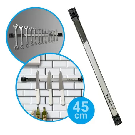 A Barra Magnética de Alta Performance é Um Produto Exclusivo Western Pro. A Barra Possui Um imã Grande Em Todo O Seu Comprimento De 45cm Que Fica Acoplado Em Uma Calha de Metal, Dessa Froma Canaliza O Fluxo Magnético e Trás Mais Força Na Condição Ideal de Utilização, A Barra de Imã é Capaz de Suportar O Peso Das Ferramentas E De Facas QUANTIDADE: 1 PEÇA Resumo: Barra Magnética de imã de 45 cm de comprimento Tração Para Segurar Ferramentas e Facas BARRA MAGNÉTICA PARA FERRAMENTAS - Dimensões da Peça: 50 x 2,9 x 2,7cm - Dimensões da Embalagem: 61 x 9 x 3,5cm - Material: Aço carbono, imã - Cor: Preta - Tipo de Embalagem: Blister - Marca: Western - Medida: 45cm (18"). - Mantenha suas ferramentas organizadas. - Instruções: 1. Marque e fure o local onde deseja instalar a Barra magnética. 2. Utilize os parafusos inclusos para prender a barra à parede. 3. Certifique-se que ela está firme. 4. Encoste a parte metálica da ferramenta na barra. - Cuidados: • Para reduzir o risco de lesões, sempre use adequadamente equipamentos de proteção individual (óculos de proteção, Máscara contra poeira, protetor auricular, luvas, etc...). Necessário ao trabalho. • Instale a peça corretamente. • Instale em local seco, fresco, longe de umidade. • Guarde estas instruções para futuras consultas. • Manter fora do alcance das crianças. * OBS: NÃO ACOMPANHA FERRAMENTA, O ANUNCIO É DA BARRA MAGNÉTICA PROFISSIONAL.