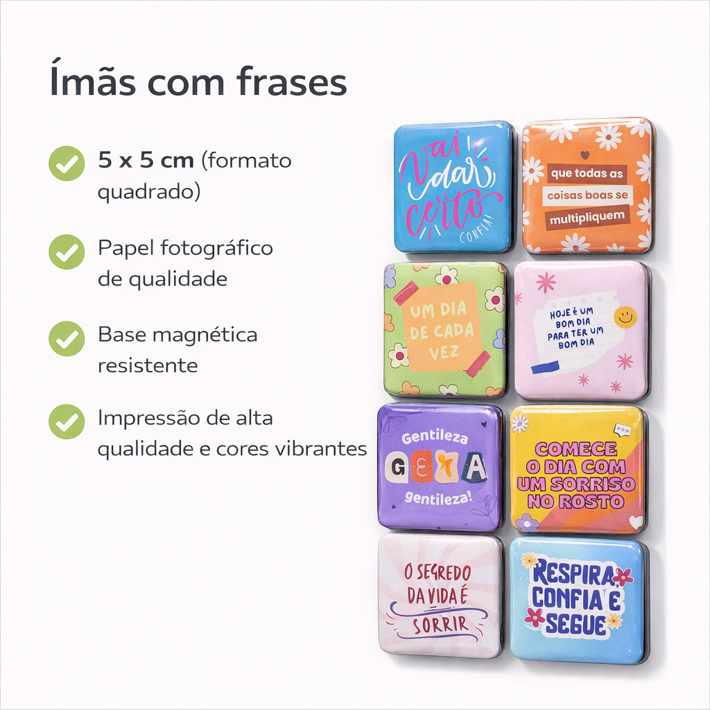 🧲 ÍMÃ DE GELADEIRA COM FRASES MOTIVACIONAIS Kits Sortidos Leve mais leveza, alegria e boas energias para o seu dia a dia 💛 Este kit de ímãs com frases motivacionais foi criado para inspirar, acolher e transformar pequenos momentos da rotina, deixando sua geladeira (ou qualquer superfície metálica) mais positiva e charmosa ✨ 📏 Tamanho / Medidas • 5 x 5 cm (formato quadrado) 📦 Variações de Quantidade • Kit 3 unidades • Kit 6 unidades ⭐ (Kit Destaque) • Kit 9 unidades • Kit 12 unidades 👉 Quanto maior o kit, maior o desconto! 💬 Sobre as Frases • Frases motivacionais, positivas e inspiradoras • Cada kit contém frases diferentes • Não há repetição de frases dentro do mesmo kit 📌 As frases são enviadas de forma sortida, sempre mantendo o mesmo estilo alegre e positivo. 🧱 Material e Acabamento • Papel fotográfico de qualidade • Base magnética resistente • Impressão de alta qualidade e cores vibrantes 🛠️ Produção • Produção artesanal • Produto pronto (não personalizável) 📦 Envio • Envio rápido após a produção • Produto embalado com cuidado e proteção ⚠️ Observações Importantes • Produto de produção artesanal • Imagens ilustrativas • As cores podem sofrer pequenas variações conforme a tela do dispositivo