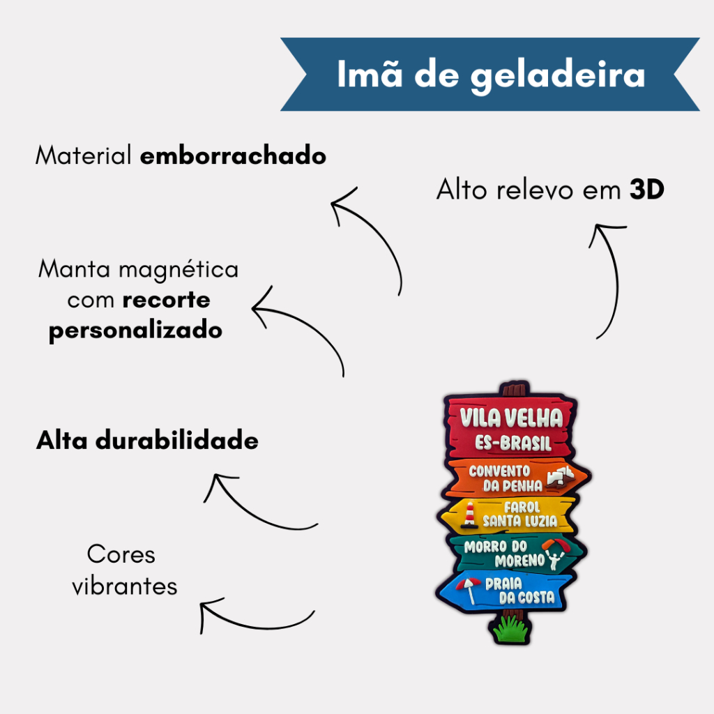 Explore o charme de Vila Velha – ES com este ímã de geladeira emborrachado exclusivo! Em formato de plaquinhas, o design reúne ícones da cidade como o Convento da Penha, o Farol de Santa Luzia, o Morro do Moreno e a Praia da Costa. Um souvenir charmoso e cheio de identidade para relembrar as belezas de Vila Velha. Detalhes do produto: • Tamanho: 80mm x 45mm • Material: Emborrachado de alta durabilidade • Acabamento: Alto-relevo • Uso e adesão: Ideal para geladeira, quadro magnético ou qualquer superfície metálica • Marca: Gommatto Souvenirs Leve, flexível e com cores vibrantes, é a lembrança perfeita para levar um pedacinho de Vila Velha para a sua geladeira. Adquira já o seu!
