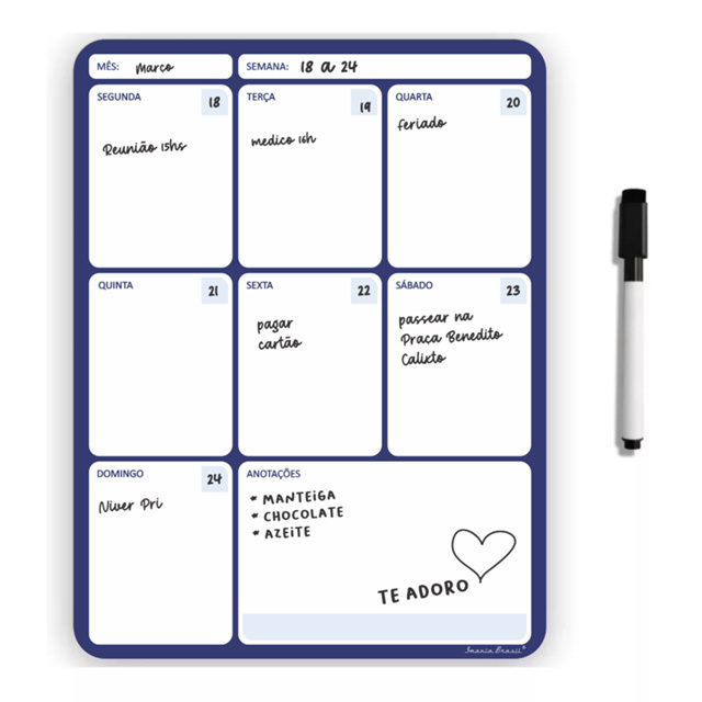 Organize sua vida com nossa lousa de geladeira inteligente! Quadro lousa magnética semanal com caneta escreve e apaga 19x25cm Organize suas tarefas da semana! A lousa magnética é ideal para centralizar as tarefas da semana. Pode ser usada para anotações, plano de estudos, negócios, tarefas, dieta, metas, compromissos, escalas.... Pronta para fixar e começar a utilizar! Ela conta com uma manta magnética na parte de trás, ideal para a fixação na geladeira ou em superfícies de metal. Acompanha caneta com apagador. Tamanho aproximado: 19x25cm Produto novo, à pronta-entrega >>> Perguntas Frequentes: 1 - Vocês emitem nota fiscal? Resposta: Nossos produtos só são vendidos com nota fiscal. 2 - O produto é novo ou usado? Resposta: Todos os nossos produtos são novos. 3 - Tem frete grátis? Resposta: O frete grátis é calculado pela Shopee com base no valor da sua compra e na região onde a entrega será realizada. Essa é uma opção oferecida pela plataforma para proporcionar aos clientes uma experiência mais vantajosa e econômica. 4 - Vocês entregam no Brasil inteiro? Como é feita a entrega? Resposta: Sim, entregamos no Brasil inteiro! A entrega é feita pela Shopee Agradecemos sua atenção e estamos à disposição para esclarecer qualquer dúvida que você possa ter. Desejamos a você uma ótima experiência de compras!