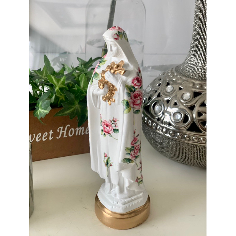 imagem santa Teresinha 20 cm manto mini Flor rosa dourada gesso