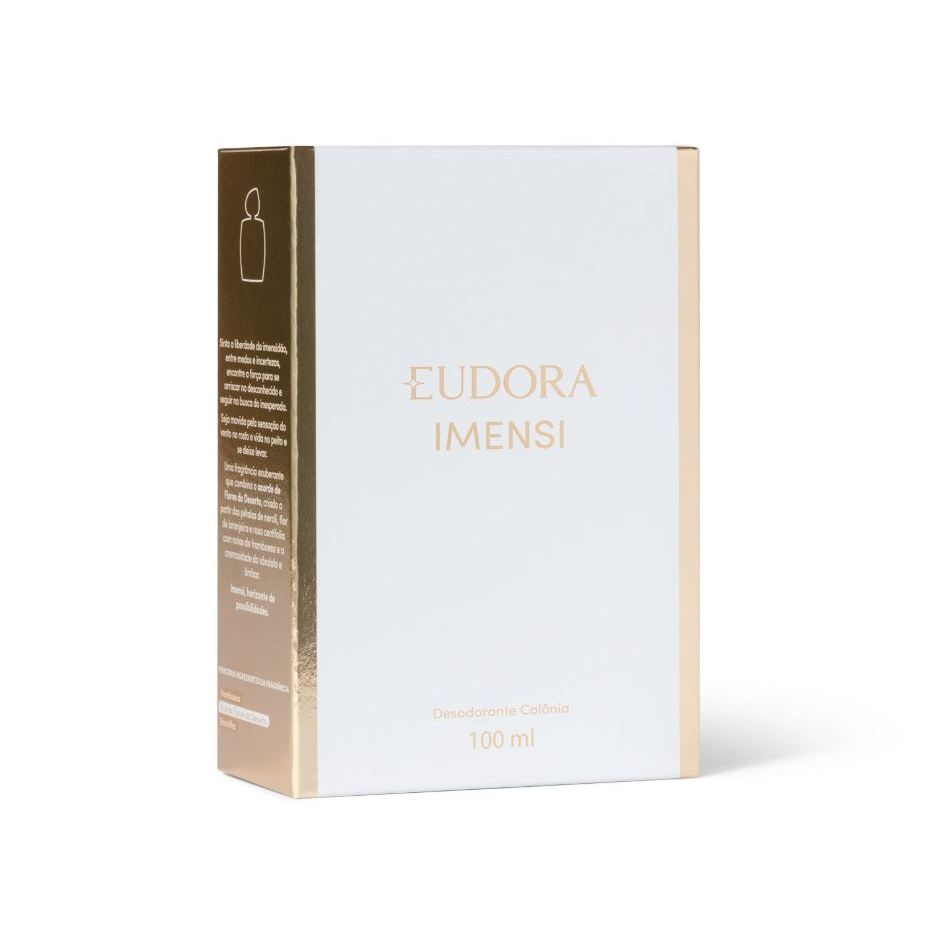 Imensi acredita que uma mulher segura e poderosa escolhe ser livre todos os dias e sente a liberdade em cada detalhe. O Combo Imensi proporciona a perfumação de um desodorante colônia e os cuidados com a pele de uma loção corporal para te manter cada vez mais linda e segura para aproveitar o lado mais bonito do mundo: - DESODORANTE COLÔNIA Imensi Desodorante Colônia é a fragrância feminina que te incentiva a encontrar a força para se arriscar no desconhecido e seguir na busca do inesperado. Inspirada nas belezas do Marrocos, suas paisagens e construções, surgiu o elemento principal da composição Imensi Eudora: o acorde Flores do Deserto, criado a partir das pétalas de neroli, flor de laranjeira, rosa centifolia com notas de framboesa e a cremosidade do sândalo e do âmbar. Família Olfativa: Floriental Ambarado. - LOÇÃO CORPORAL A Loção Hidratante Desodorante Corporal Imensi traz a mesma fragrância exuberante do desodorante colônia da linha, proporcionando hidratação por até 48 horas. Com nova fórmula de rápida absorção, deixa a pele macia, perfumada e desodorizada sem ser pegajosa. Para quem deseja ser movida pela sensação do vento no rosto, vida pulsante no peito e se deixar levar, Imensi traz a loção corporal que te incentiva a se arriscar. - BODY SPRAY Desodorante Body Imensi possui a mesma fórmula e volumetria de antes, agora em nova embalagem. Sinta a explosão da fragrância Imensi em cada borrifada! O Body Spray garante para o seu dia a dia: * Perfumação e ação desodorante para o corpo todo, inclusive as axilas * Sensação de frescor prolongado * Fórmula que não resseca a pele Este body spray feminino de fragrância fresca e leve pode ser usado no corpo todo, inclusive, nas axilas. Sinta a explosão de fragrâncias e frescor com os Body Sprays Eudora! Livre de alumínio. Nenhum produto Eudora é testado em animais, ou seja, estes itens possuem selo Cruelty Free.