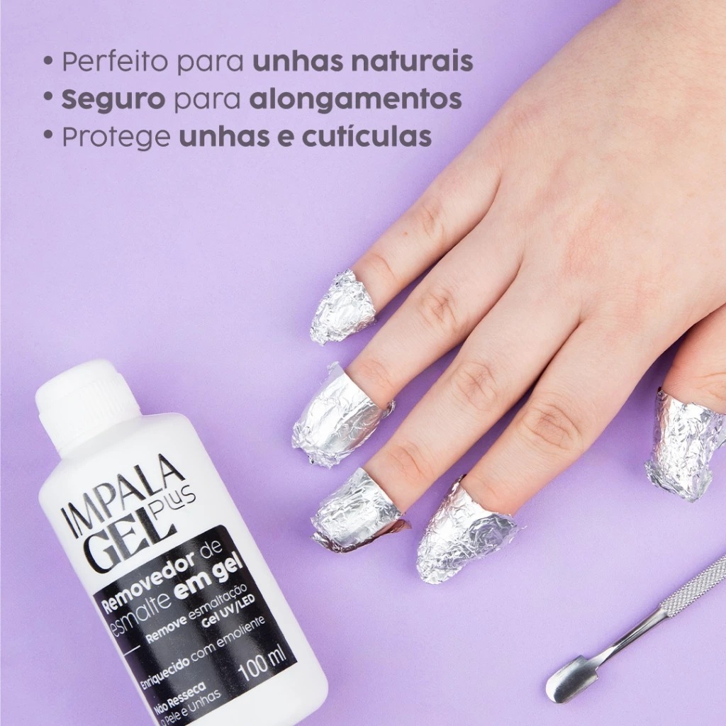 Neste anuncio voce poderá escolher uma unidade ou um kit com 3 removedores REMOVEDOR - Impala Gel Plus Trazendo agilidade e eficiência, o Removedor de Esmalte em Gel Impala remove o esmalte em minutos, sem danificar suas unhas. Sua fórmula avançada foi desenvolvida especificamente para esmaltes em gel com cura UV LED, enriquecida com emolientes e que não ressecam a pele e as unhas. Sem esforço excessivo, suas unhas ficam limpas e prontas para a próxima aplicação de maneira prática e rápida! Todos os produtos são dermatologicamente testados. Após remover o brilho do Top Coat utilizando uma lixa, envolva as unhas com algodão umedecido com o Removedor para esmalte em gel Impala Gel Plus e, em seguida, envolva cada dedo com papel alumínio. Deixe agir por 15 a 20 minutos, em seguida retire o papel alumínio e o algodão, e remova o esmalte com uma espátula para cutículas ou com um palito. Se necessário, aplique mais removedor e repita o processo.