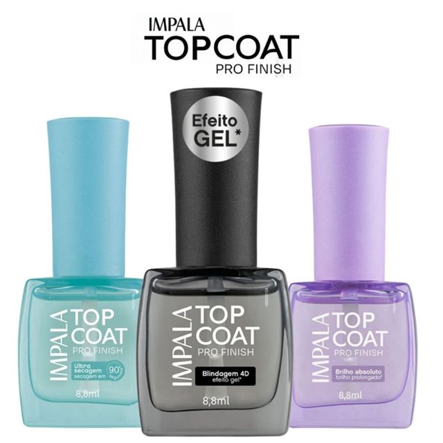| Impala Top Coat Esmalte Efeito Gel + Brilho Absoluto Prolongado + ... este produto | R$ 21,90 | 51% | 4.9/5 | 282 |
