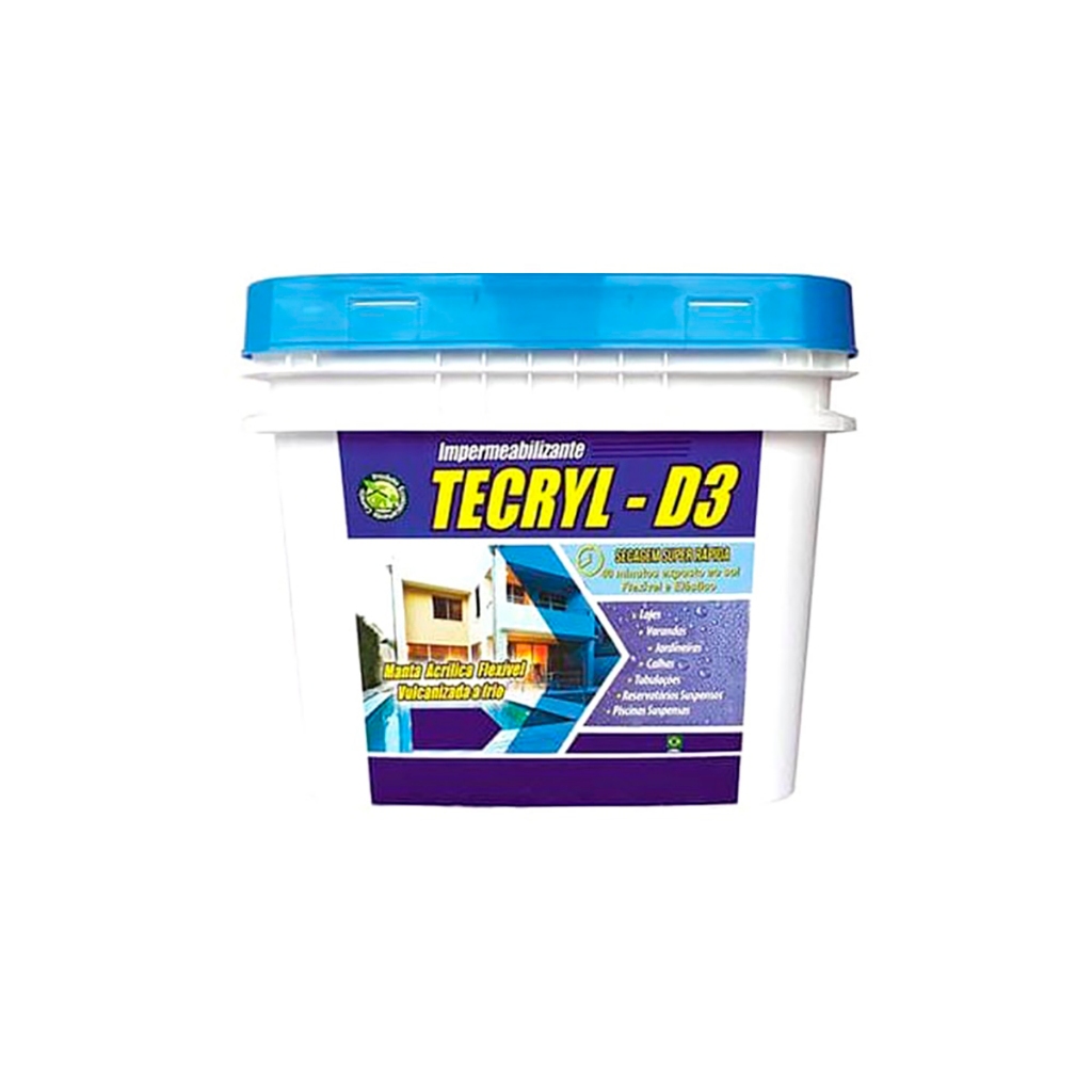 O Impermeabilizante Acrílico 15kg Tecryl D3 nas Cores Branco e Cinza é um impermeabilizante flexível de base acrílica, aplicável a frio que já vem pronto para uso, eliminando a utilização de maçaricos e caldeiras. Não apresenta qualquer emenda na sua totalidade, não havendo, portanto, a existência de pontos fracos ou vulneráveis.Produzido dentro dos mais altos padrões de qualidade, quando aplicado, forma uma manta impermeabilizante de grande aderência, excelente estabilidade térmica e de grande resistência à ação dos raios ultravioletas, após a cura forma uma manta elástica, flexível, suportando eventuais solicitações estruturais, em juntas de dilatação e fissuras. Precisando apenas ser homogeneizado com misturador mecânico ou manual e aplicado com trincha, rolo de lã de carneiro ou pincel, de 2 a 4 demãos cruzadas (1 a 2 kg por m²), conforme indicação da tabela de média de consumo. Intervalo de tempo entre as demãos está ligado às condições de intemperismo do local. Normalmente, o intervalo entre camadas é de 30 a 40 minutos em dias arejados. Não é indicado a aplicação em dias chuvosos, exceto em áreas cobertas, resguardando o tempo entre a aplicação e as demãos seguintes devido à secagem do produto que será mais demorada. Recomendações: - Nunca aplicar em dia com prognóstico de chuva. Ideal é fazer aplicação em áreas abertas após dois dias de sol consecutivos; - Cura de 24h a 48h em locais arejados e se for em locais fechados, como piscinas e reservatórios suspensos até 7 dias; - Após cura, fazer teste de estanqueidade por 72h; - Reservatório e caixa d’água potável, é importante que faça sanitização completa após cura do material e descarte essa água para em seguida abastecê-la novamente; - Aceita assentamentos de argamassas; - Em locais de trânsito, torna-se necessário a execução de piso de proteção; - Não aplicar sobre superfícies úmidas, por pressão negativa ou capilaridade; - Não aplicar sobre substratos betuminosos (asfalto) ou com solventes, pisos cerâmicos e pedra; - Não é transitável; - Para sua segurança, é necessário utilizar os seguintes equipamentos de proteção individual: Capacete, máscara, luvas de borracha, óculos de proteção e botas de segurança. Características Técnicas: - Balde: 15 kg; - Aplicação: Lajes e coberturas, calhas, banheiros, cozinhas, áreas de serviço, marquises, telhados; - Ideais para: Caixas d’água, telhas de amianto e zinco, proteção externa de tubulações à temperaturas ambientes normais e estruturas metálicas, em geral, em impermeabilizações como pintura refletora de calor; - Consumo Apropriado: 1 à 2 kg/m²; Validade: - 2 anos a partir da data de fabricação.