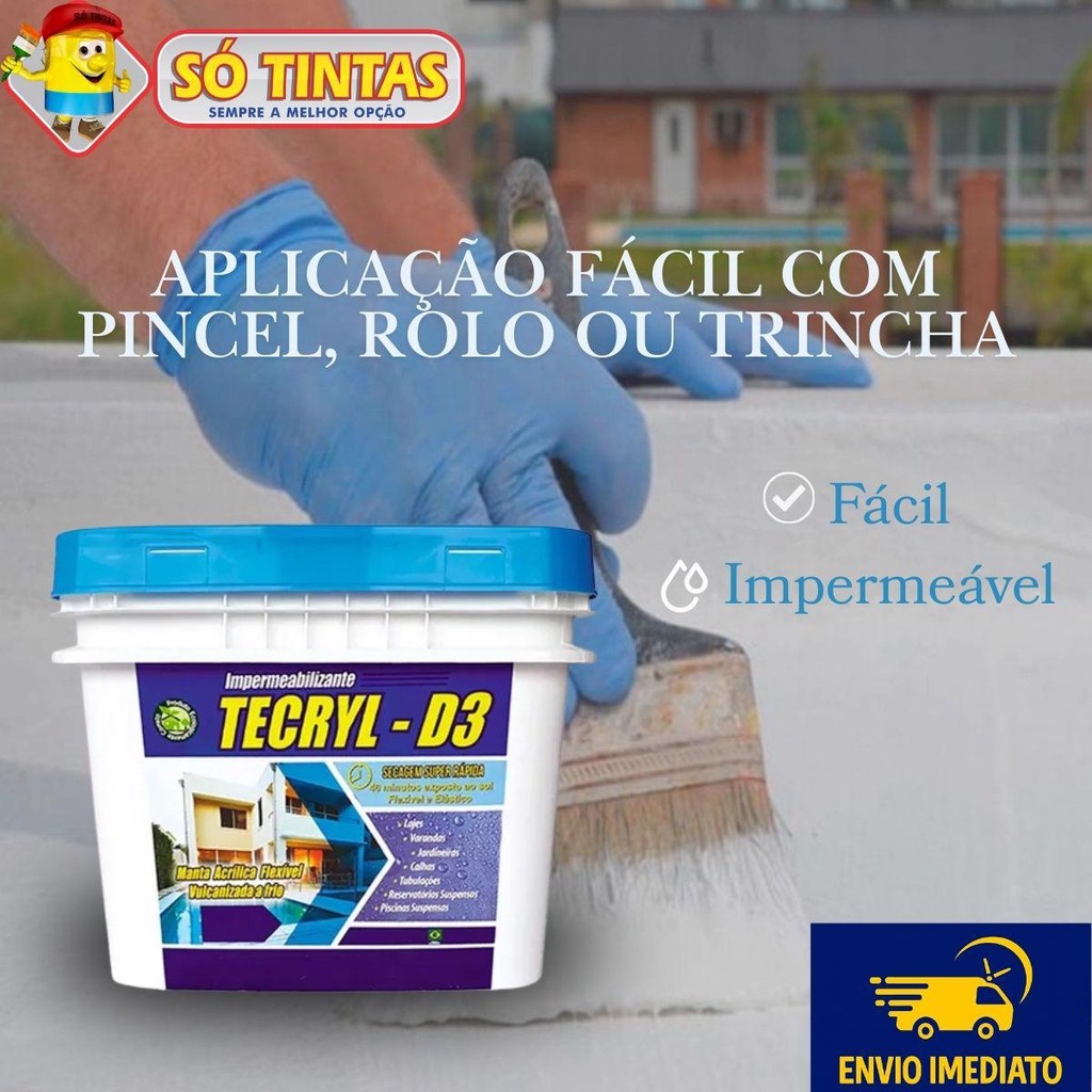 O que é o Tecryl D-3 O Tecryl D-3 4kg é um impermeabilizante acrílico flexível, pronto para uso e de aplicação a frio, que forma uma manta contínua, sem emendas e altamente aderente. Resistente às intempéries e aos raios UV, proporciona elasticidade, estabilidade térmica e durabilidade, sendo ideal para impermeabilizar áreas expostas à umidade e variações climáticas. Especificações Técnicas Produto: Impermeabilizante Acrílico Tecryl D-3 Marca: Tecryl Cor: Azul Volume: Balde 4kg Composição: Resinas acrílicas, aditivos e cargas minerais Consumo: Aproximadamente 2,0 kg/m² (0,5 kg/demão/m²) Rendimento médio: Paredes externas e telhados: 1,0kg/m² Varandas, banheiros e áreas de serviço: 1,5kg/m² Lajes, calhas, marquises, box e outros: 2,0kg/m² Piscinas e reservatórios elevados: 2,0kg/m² Demãos: 2 a 4 demãos cruzadas, com intervalo de 30 a 40 min entre elas Secagem: Ao toque: 30 a 40 minutos Cura: 24 a 48 horas (até 7 dias em locais fechados, como piscinas) Validade: 24 meses após a fabricação, se armazenado em local seco e arejado Contraindicações: Não aplicar sobre superfícies úmidas, substratos betuminosos, pisos cerâmicos ou pedra. Não é transitável. Por que escolher o Tecryl D-3 ✔ Impermeabilizante pronto para uso, de fácil aplicação ✔ Flexível e elástico, acompanha movimentos da estrutura ✔ Alta resistência aos raios UV e variações climáticas ✔ Substitui mantas tradicionais, sem necessidade de maçarico ✔ Excelente custo-benefício e durabilidade ✔ Produto ecológico, à base d’água Onde usar Paredes externas Telhados de fibrocimento e galvanizados Varandas, banheiros e áreas de serviço Lajes, calhas e marquises Piscinas e reservatórios elevados (com sanitização após cura) Dicas de aplicação Aplique sempre em dias secos e preferencialmente após 2 dias de sol consecutivos. Use tela de poliéster Tecryl Super Tela entre a 1ª e 2ª demão em áreas acima de 50m², juntas de dilatação e fissuras. Respeite o consumo recomendado para cada área. Após a cura, realize teste de estanqueidade em reservatórios e piscinas. Utilize EPI’s adequados: capacete, máscara, luvas, óculos e botas. Como aplicar Preparação da superfície: Certifique-se de que esteja limpa, seca e sem graxa, óleo, poeira ou partículas soltas. Reboco novo deve estar curado (mín. 28 dias). Homogeneização: Misture bem o produto antes da aplicação. Aplicação: Aplique de 2 a 4 demãos cruzadas com trincha, rolo de lã de carneiro ou pincel. Intervalo entre demãos: Respeite 30 a 40 minutos em condições normais. Finalização: Aguarde de 24 a 48h para a cura total. Em locais fechados (piscinas/caixas d’água), até 7 dias. Perguntas Frequentes Acompanha nota fiscal? ✔ Sim, todos os produtos são enviados com nota fiscal. Posso comprar mais de 1 unidade no mesmo pedido? 🚚 Para embalagens de 4kg, é permitido comprar mais de 1 unidade por pedido, conforme disponibilidade da transportadora. O envio é por Correios? ✔ O envio é realizado pela transportadora da Shopee, garantindo segurança e agilidade na entrega. 👉 Garanta já o seu Tecryl D-3 4kg e impermeabilize lajes, telhados, calhas, paredes e reservatórios com alta performance, durabilidade e segurança.