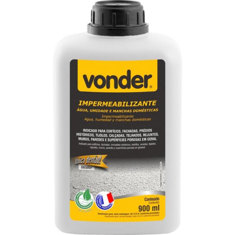 Impermeabilizante Contra Água, Umidade e Manchas Naturais 900 ML VONDER Referência: 51.81.000.100Protege permanentemente todos os materiais porosos contra a penetração de água, umidade e manchas naturais.Utilizado em edifícios, fachadas, prédios históricos, calçadas, telhados, terraços, varandas, áreas de piscinas e superfícies porosas em geral.Efetue sempre um teste sobre uma amostra da superfície a tratar.Com base aquosa e sem solventes de petróleo ou silicone, é um produto totalmente ecológico.É permeável ao ar e vapor de água e totalmente invisível após a secagem, não alterando a aparência ou cor dos materiais.É resistente aos raios UV e não amarela a superfície tratada.Retarda o envelhecimento da superfície e facilita a manutenção.É necessário apenas 1 demão, sendo de fácil aplicação e ainda é o mais econômico do mercado.DETALHES TÉCNICOS:Volume (ml):900 ml.Cor do impermeabilizante:Incolor.Rendimento aproximado:Desta embalagem até 13,5 m² (conforme porosidade).Garantia - E (CDC):Garantia legal: 90 dias*Imagens meramente ilustrativas
