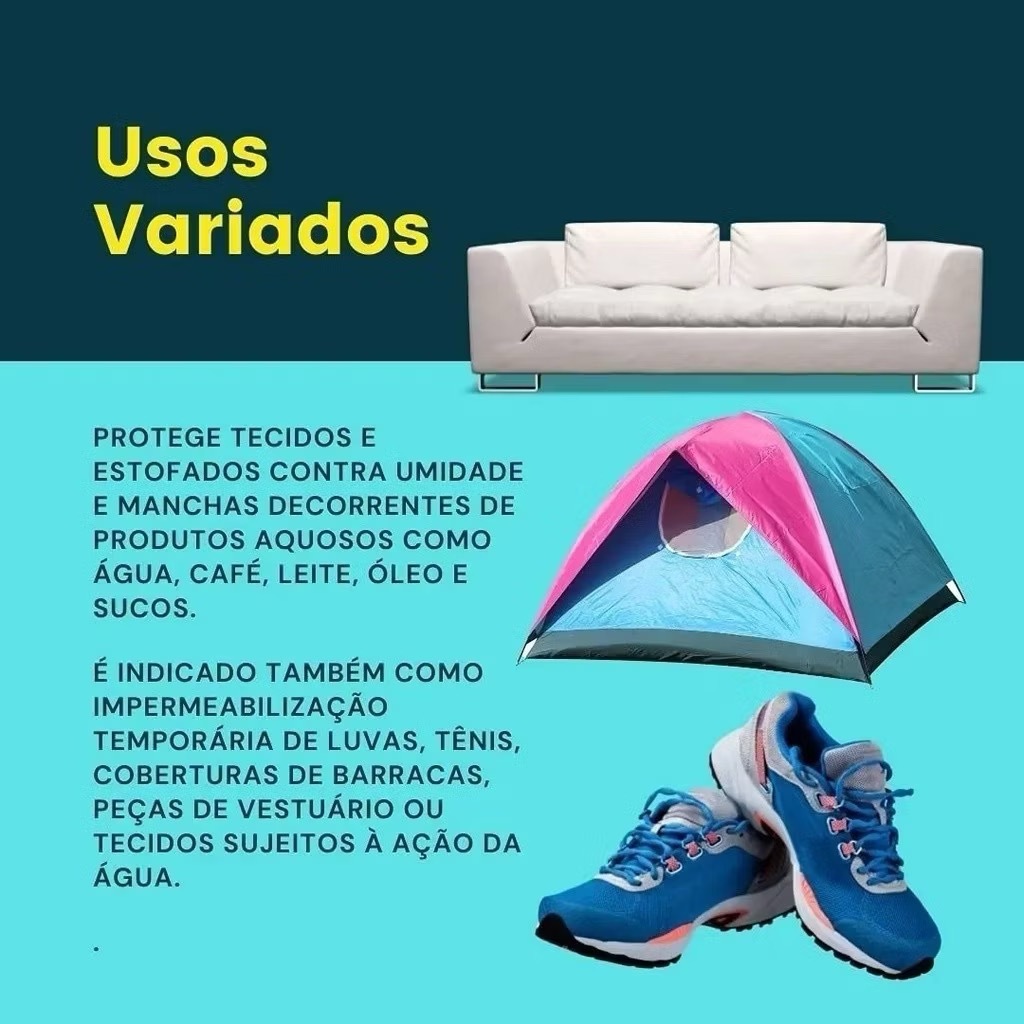 🛡️ Impermeabilizante de Tecidos Ultra Lub 325ml Proteção prática e eficiente para sofás, tênis, cadeiras, roupas e estofados. Mantenha seus tecidos sempre limpos com o Impermeabilizante Ultra Lub! Ele cria uma barreira invisível que repele água, óleos e sujeiras, evitando manchas e prolongando a vida útil dos seus itens. ⭐ Principais Características 🟦 Composição feita para ser utilizado em Tênis. 🟦 Proteção contra líquidos: evita absorção de água, café, vinho, sucos e outros. 🟦 Fácil aplicação: basta pulverizar para formar a camada protetora. 🟦 Serve para diversos tecidos: algodão, poliéster, camurça, veludo e outros. 🟦 Proteção duradoura: mantém os tecidos com aparência de novos por mais tempo. 🟦 Não altera cor nem toque: sua ação é invisível e não deixa resíduos. 🎯 Indicado Para - Sofás, poltronas e cadeiras - Tapetes e carpetes - Almofadas e cortinas - Tênis, roupas e jaquetas - Itens têxteis que precisam de proteção contra sujeira e líquidos 📝 Modo de Usar 1️⃣ Limpe e seque o tecido antes da aplicação. 2️⃣ Agite bem o frasco. 3️⃣ Pulverize a 20 cm de distância, cobrindo toda a superfície. 4️⃣ Aguarde 24 horas para uso. 5️⃣ Reaplique quando necessário para reforçar a proteção. 📦 Especificações - Marca: Ultra Lub - Conteúdo: 325ml - Rendimento: até 3 m² por frasco (varia conforme o tecido) 💡 Benefícios - Evita manchas e sujeiras - Aumenta a durabilidade dos tecidos - Mantém o aspecto original por mais tempo - Fácil aplicação e resultado rápido ⚠️ Cuidados - Use em local bem ventilado. - Mantenha fora do alcance de crianças e animais. - Armazene em local fresco, seco e protegido do sol.