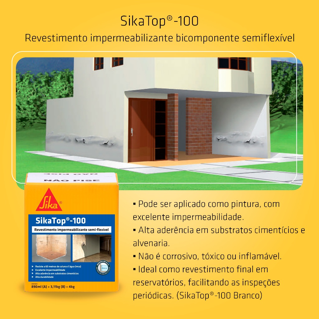 SIKATOP®-100 IMPERMEABILIZANTE PARA BANHEIROS E CAIXAS D'ÁGUA - BRANCO CAIXA 18kg | SIKA SikaTop®-100 é um revestimento impermeabilizante semi-flexível, bicomponente, de alta performance, à base de cimento, cargas minerais e resina acrílica. Pronto para o uso, basta misturar os componentes A (líquido) e B (pó). Ideal para aplicação em superfícies de concreto, argamassa e alvenaria. Oferece excelente aderência, resistência à umidade e proteção contra pressão hidrostática positiva e negativa. Disponível na cor Branco, em embalagem com 18kg (componente A + B pré-dosado para mistura). Áreas de Aplicação: - Caixas d’água, reservatórios, piscinas, poços de elevadores, tanques e cisternas. - Paredes internas de silos, armazéns, depósitos e residências com umidade. - Baldrames, subsolos, galerias de águas pluviais e servidas. - Pisos e paredes de áreas frias como banheiros, lavandeiras e cozinhas. - Paredes em contato direto com o solo. - Revestimento protetor de mármores, granitos e pedras naturais claras antes do assentamento. Vantagens: - Pronto para uso: basta misturar os componentes A e B. - Aplicação fácil como pintura (broxa, trincha, pincel ou vassoura de pelos). - Alta impermeabilidade. - Excelente aderência em concreto, argamassa e alvenaria. - Resistente à pressão de água positiva e negativa. - Reduz a carbonatação do concreto. - Não corrosivo, não tóxico e não inflamável. - Ideal para inspeção visual em reservatórios. - Cura úmida recomendada para melhor desempenho. Dados Técnicos: - Composição: cimento Portland, cargas minerais, aditivos e resina acrílica. - Embalagem: 18kg (componente A + B). - Cor: Branco. - Mistura: proporção A:B = 1:3,5. - Rendimento: 1kg/m² por demão. Consumo por Tipo de Aplicação: - Umidade ascendente em paredes: 2 demãos = 2kg/m². - Impermeabilização de subsolos e paredes enterradas: 3 demãos = 3kg/m². - Reservatórios e caixas d’água: 3 a 4 demãos = 3 a 4kg/m². - Áreas frias: 2 demãos = 2kg/m². Instruções de Aplicação: - A superfície deve estar limpa, isenta de poeira, graxa, pintura ou qualquer contaminante. - Corrigir falhas com argamassa antes da aplicação. - Umedecer a superfície antes da primeira demão (não saturar). - Misturar os componentes até obter massa homogênea. - Aplicar de 2 a 4 demãos cruzadas com trincha, broxa ou vassoura de pelos. - Respeitar o tempo de secagem entre demãos (3 a 6 horas). - Realizar cura úmida por no mínimo 3 dias. - Aguardar 5 dias após a última demão para liberar a área. - Lavar com água e sabão neutro antes de encher tanques ou reservatórios. - Realizar teste de estanqueidade por no mínimo 72 horas após a cura. - Em áreas como ralos e juntas, reforçar com tela de poliéster. Cuidados e Observações - Não aplicar sob sol intenso. - Aplicar em espessura uniforme para evitar fissuras.