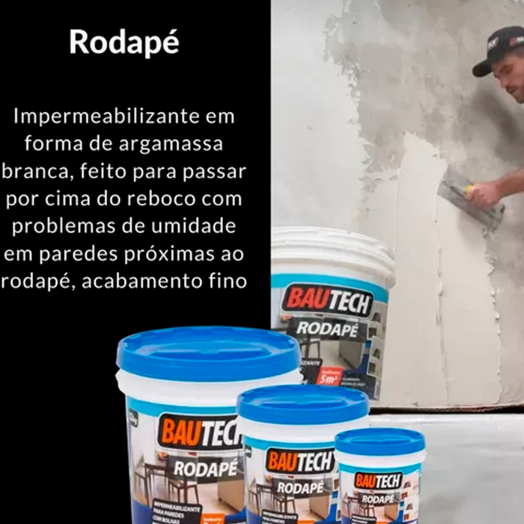 BAUTECH RODAPÉ é um impermeabilizante na forma de argamassa branca, desenvolvido especialmente para combater problemas de umidade em paredes, principalmente nas áreas próximas ao rodapé. Sua formulação proporciona um acabamento fino e liso, e, com apenas uma camada, oferece impermeabilização eficaz, aderindo diretamente sobre o reboco e deixando a parede super branca. PRINCIPAIS CARACTERÍSTICAS Recupera paredes com problemas de umidade nas áreas próximas ao rodapé. Aplicação simples: basta remover as partículas soltas da parede e aplicar o BAUTECH RODAPÉ. Solução definitiva para umidade nas paredes da sua residência. Pode ser aplicado diretamente sobre blocos, tijolos ou reboco, tanto em ambientes internos quanto externos. Alta resistência a pressões positivas e negativas. CAMPO DE APLICAÇÃO Ideal para reparo de paredes danificadas com degradação da pintura. Perfeito para casas localizadas em áreas litorâneas, casas antigas ou imóveis com alta presença de umidade proveniente do solo ou vizinhos. Essa versão traz uma leitura mais fluida e organizada, destacando os benefícios e facilitando a compreensão dos principais pontos.