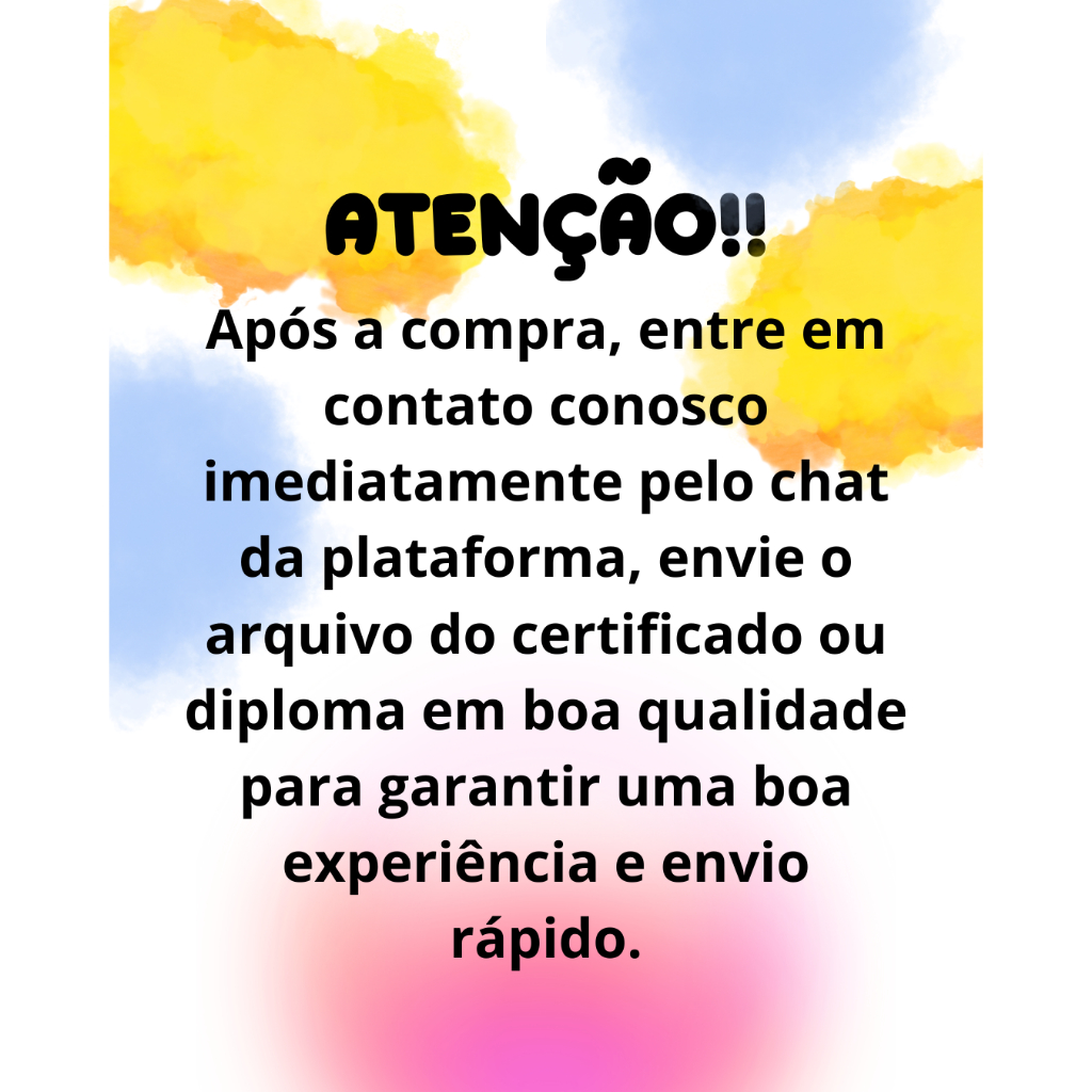 Print Xpresso traz para você a solução prática e elegante para seus certificados, diplomas, declarações e documentos importantes. Nosso kit inclui a impressão do seu certificado/diploma (enviado por você) já montado em uma moldura 20x30cm (A4) com frente em acetato transparente, garantindo proteção, durabilidade e um visual sofisticado. Diferenciais: • Moldura 20x30cm (A4) com acetato • Certificado/diploma impresso a partir do arquivo enviado pelo cliente • Produto já vai montado na moldura • Envio rápido: até 24h após o recebimento do arquivo • Perfeito para premiações, eventos, empresas e homenagens Atenção: Após a compra, entre em contato conosco o quanto antes para enviar o arquivo do certificado/diploma que deseja imprimir.
