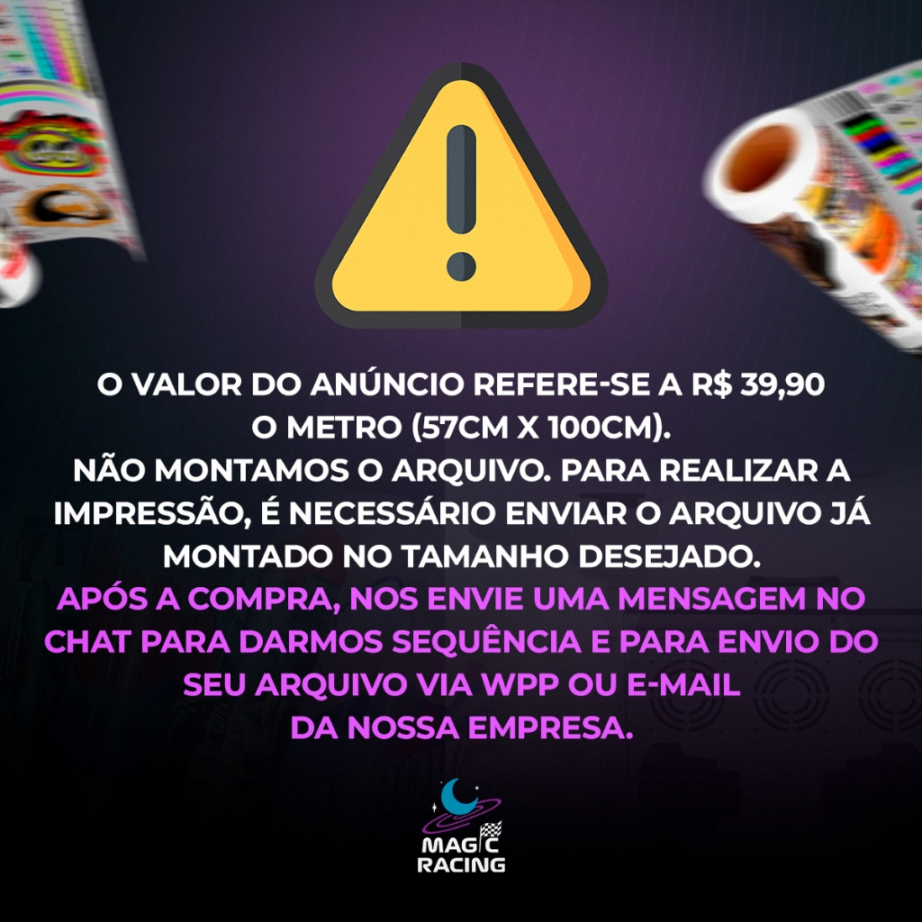 🚨 Atenção! ⚠️O valor do anúncio refere-se a R$ 39,90 por metro (57 cm x 100 cm) de DTF Têxtil. 🚨Importante: não realizamos a montagem do arquivo. Para a impressão, é necessário enviar o arquivo já montado, no tamanho desejado. Após a compra, envie uma mensagem no chat para darmos sequência ao atendimento e combinarmos o envio do seu arquivo via WhatsApp ou e-mail da nossa empresa.