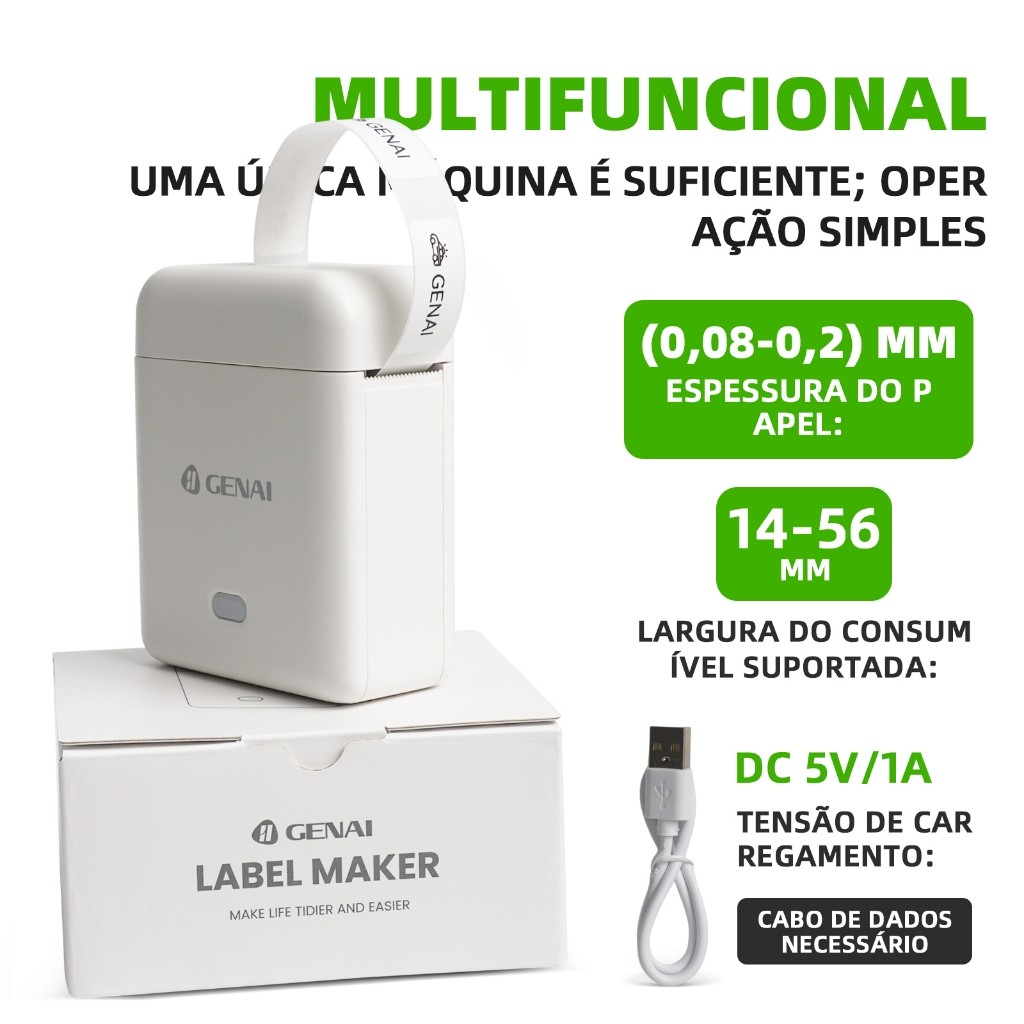 🔍 Principais Especificações Peso: 128g (mais leve que um celular) Dimensões: 7.5cm × 9.2cm × 4cm (compacta e portátil) Tecnologia: Impressão térmica sem tinta (inkless) Largura de etiqueta suportada: 14–56mm Espessura do papel: 0,08–0,2mm Alimentação: DC 5V/1A (carregamento via cabo USB) Conexão: Bluetooth (emparelhamento com app LuckJingle) ✨ Por que escolher a GENAI Label Maker? 1. Sem tinta, sem complicações Tecnologia inkless (sem tinta, sem cartuchos) — economiza dinheiro e evita bagunça Impressão térmica de alta qualidade, sem risco de vazamentos ou entupimentos Manutenção zero, basta trocar o rolo de etiquetas 2. Design ultraportátil Apenas 128g — leve o suficiente para levar no bolso, bolsa ou mochila Tamanho compacto (7.5×9.2×4cm) — não ocupa espaço em casa ou no escritório Ideal para viagens, trabalho externo, acampamentos e uso diário 3. Etiquetas ecológicas e resistentes Papel à prova d’água, com alta adesividade, resistente ao rasgo e ao arranhão Fita adesiva forte, ideal para superfícies como plástico, madeira, vidro e metal Compatível com diversos tipos de rolos de etiquetas para diferentes usos 4. Multifuncional e personalizável Conecte-se ao app LuckJingle via Bluetooth para editar e imprimir rótulos Modelos gratuitos variados: texto, códigos de barras, QR codes, imagens, stickers, datas e mais Crie rótulos personalizados para organização doméstica, escritório, lojas e hobbies 5. Fácil de usar em 3 passos Colocar o papel: Insira o rolo de etiquetas na impressora Editar: Conecte ao app e personalize seu rótulo Colar: Imprima e aplique a etiqueta no local desejado 6. Versatilidade de uso Organização doméstica: Roupas, armários, temperos, frutas, medicamentos Escritório: Documentos, pastas, interruptores, etiquetas de ativos Negócios: Etiquetas de preço, códigos de barras, etiquetas de produtos Educação: Etiquetas para livros, materiais escolares e organização de aulas 7. Proteção e durabilidade Design de dissipação de calor para operação estável e longa vida útil Materiais resistentes e construção compacta para uso frequente Sem peças móveis complexas, reduzindo o risco de falhas ⚠️🔥⚠️🔥⚠️especificações introdução⚠️🔥⚠️🔥⚠️ Conjunto-1: 1 x impressora de etiquetas portátil 1 x Rolo de etiqueta de amostra 1 x Cabo USB para carregamento Conjunto-2: 1 x impressora de etiquetas portátil 1 x Rolo de etiqueta de amostra 1 x Cabo USB para carregamento 5 x Papel de etiqueta branca de 14*30mm Conjunto-3: 1 x impressora de etiquetas portátil 1 x Rolo de etiqueta de amostra 1 x Cabo USB para carregamento 5 x 14 * 40 mm Papel adesivo colorido Conjunto-4: 1 x impressora de etiquetas portátil 1 x Rolo de etiqueta de amostra 1 x Cabo USB para carregamento 5 x papel de etiqueta branca de 14*30mm 5 x14*40mm Papel adesivo colorido 📦 O que está incluso? Impressora de Etiquetas GENAI Label Maker 1 rolo de etiqueta de teste Cabo USB para carregamento Manual de instruções em português 🛡️ Segurança e confiança A GENAI Label Maker é certificada por normas internacionais (FCC, CE, RoHS), garantindo segurança e qualidade. A tecnologia sem tinta evita riscos de toxicidade, tornando-a segura para uso em ambientes domésticos e infantis. Transforme a bagunça em ordem com a Impressora de Etiquetas GENAI — leve, prática e essencial para sua vida!