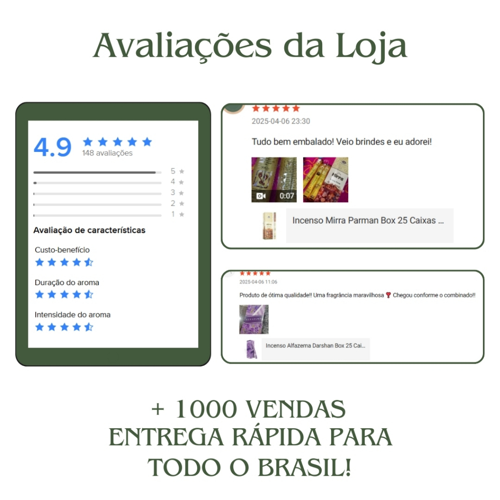 - Vendido por loja bem avaliada (Poli Incensos — 4.9/5)